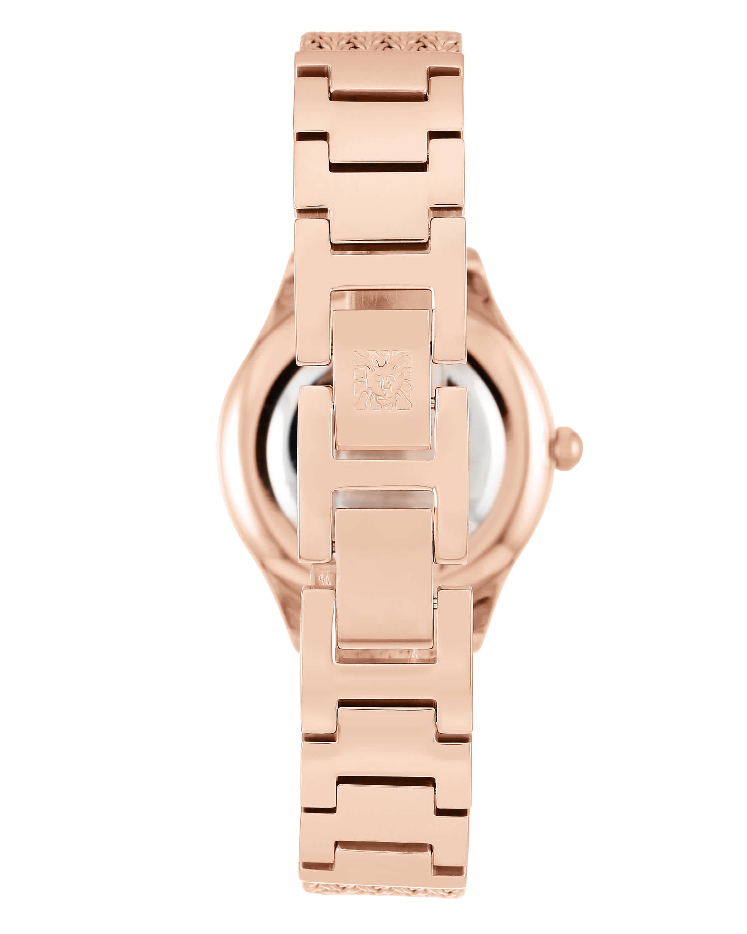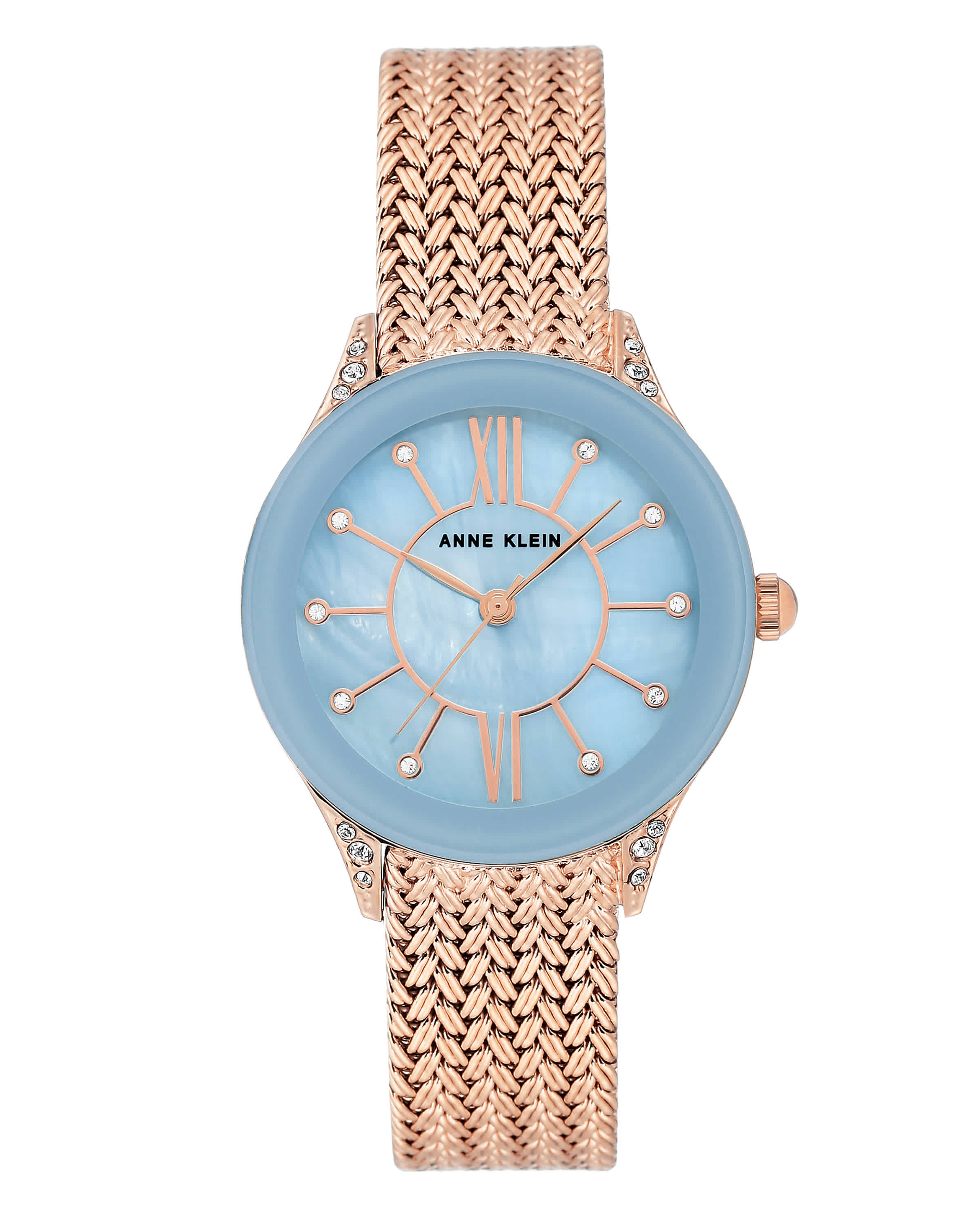 Metal case with a bracelet band. Fixed metal bezel. Light blue dial with rose gold-tone hands and index markers, Roman numerals hour markers. Dial Type: Analog. Japanese quartz movement. Scratch resistant mineral crystal. Pull/push crown. Solid case back. Round case shape, case size: 30mm, case thickness: 7.4mm. Band width: 14x14mm. Jewelry clasp. Water resistant at splash resistant. Functions: hour, minute, second. Anne Klein Light Blue Dial Ladies Watch 2208LBRG.