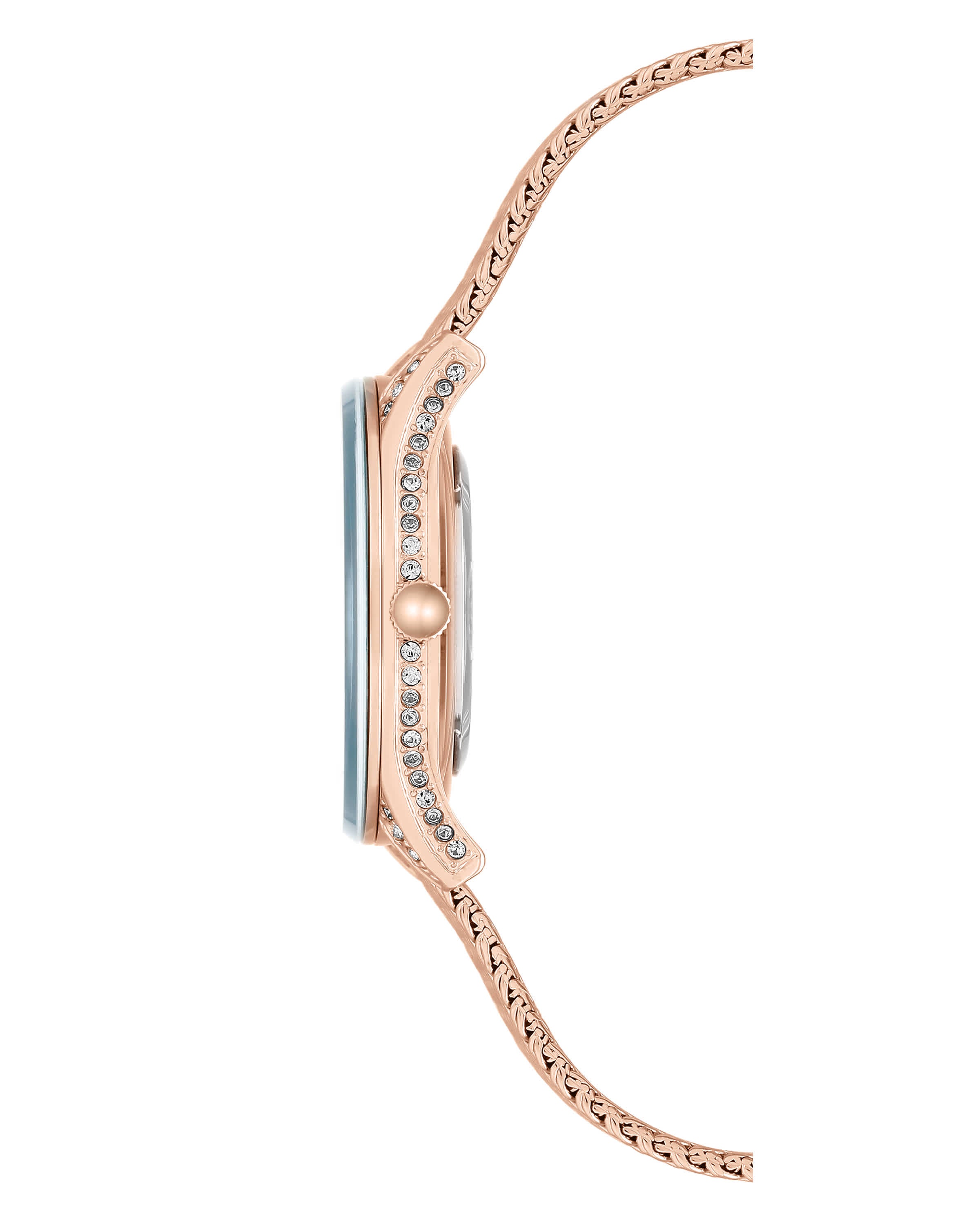 Metal case with a bracelet band. Fixed metal bezel. Light blue dial with rose gold-tone hands and index markers, Roman numerals hour markers. Dial Type: Analog. Japanese quartz movement. Scratch resistant...