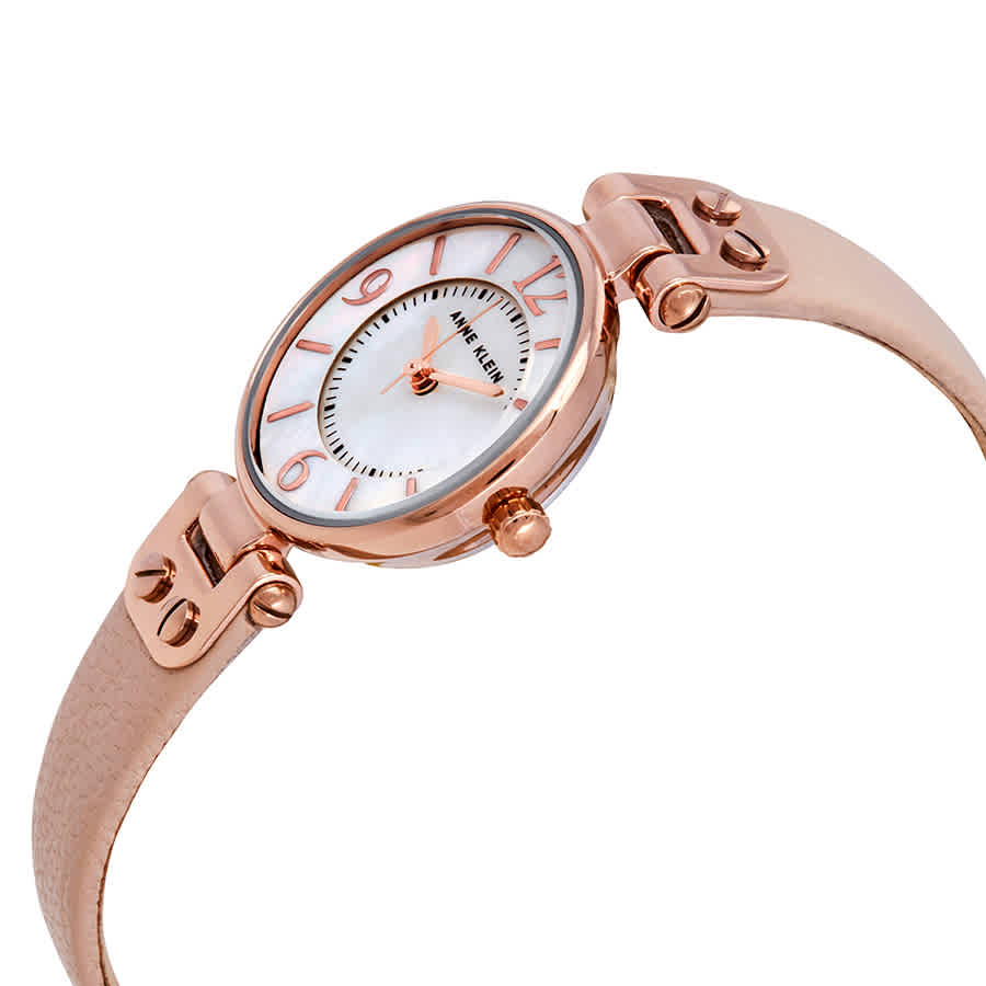 Rose gold-tone stainless steel case with a pink leather strap. Fixed rose gold-tone stainless steel bezel. Mother of pearl dial with rose gold-tone hands and index hour markers. Arabic numerals mark the 3, 6, 9 and 12 o'clock positions. minute markers around an inner ring. Dial Type: Analog. Quartz movement. Scratch resistant mineral crystal. Pull / push crown. Solid case back. Round case shape, case size: 26 mm, case thickness: 9 mm. Band width: 12 mm. Tang clasp. Water resistant at 30 meters / 100 feet. Functions: hour, minute, second. Additional Info: withstands rain and splashes of water, but not showering or submersion. Casual watch style. Anne Klein Mother of Pearl Dial Ladies Watch 10-9442RGLP.