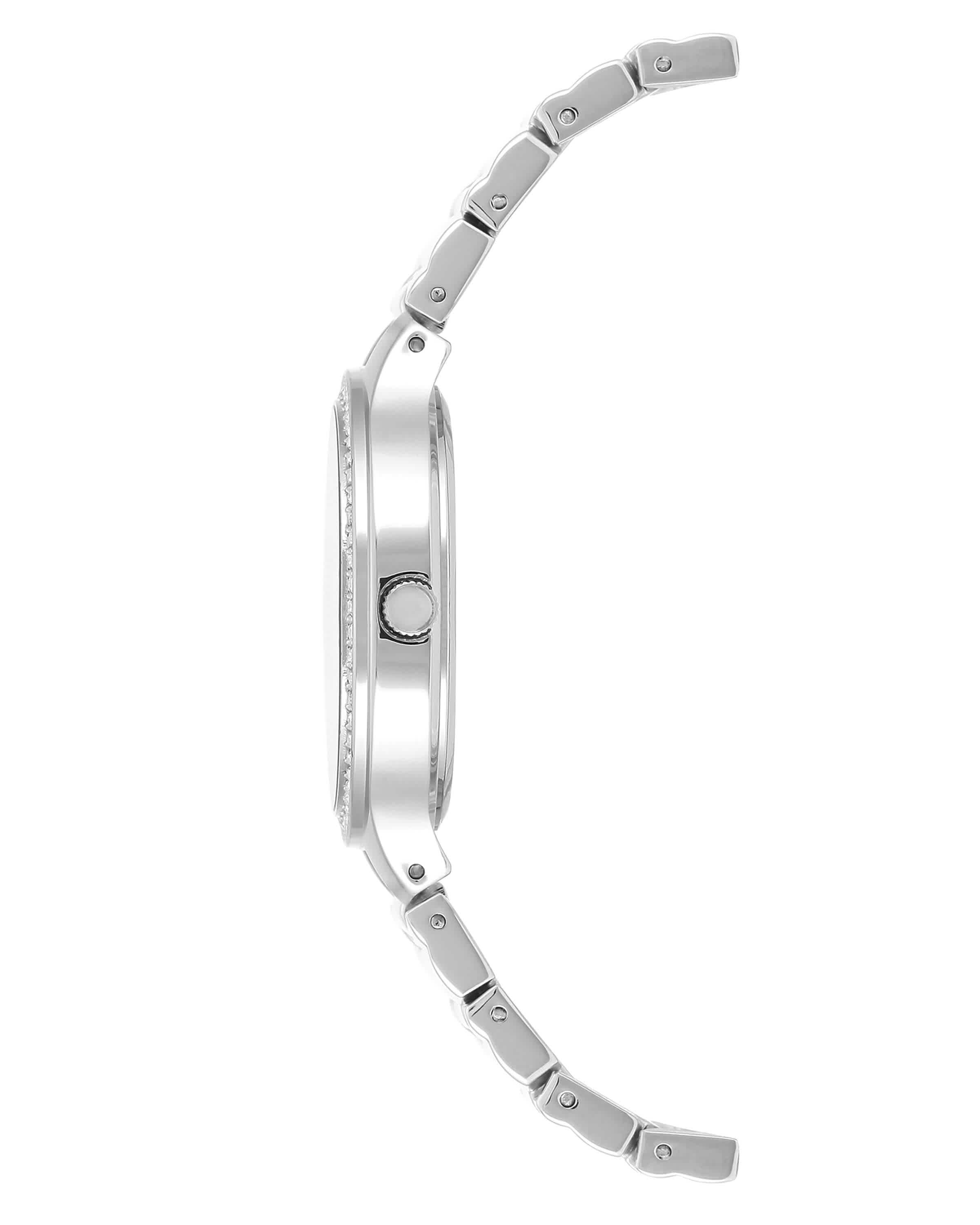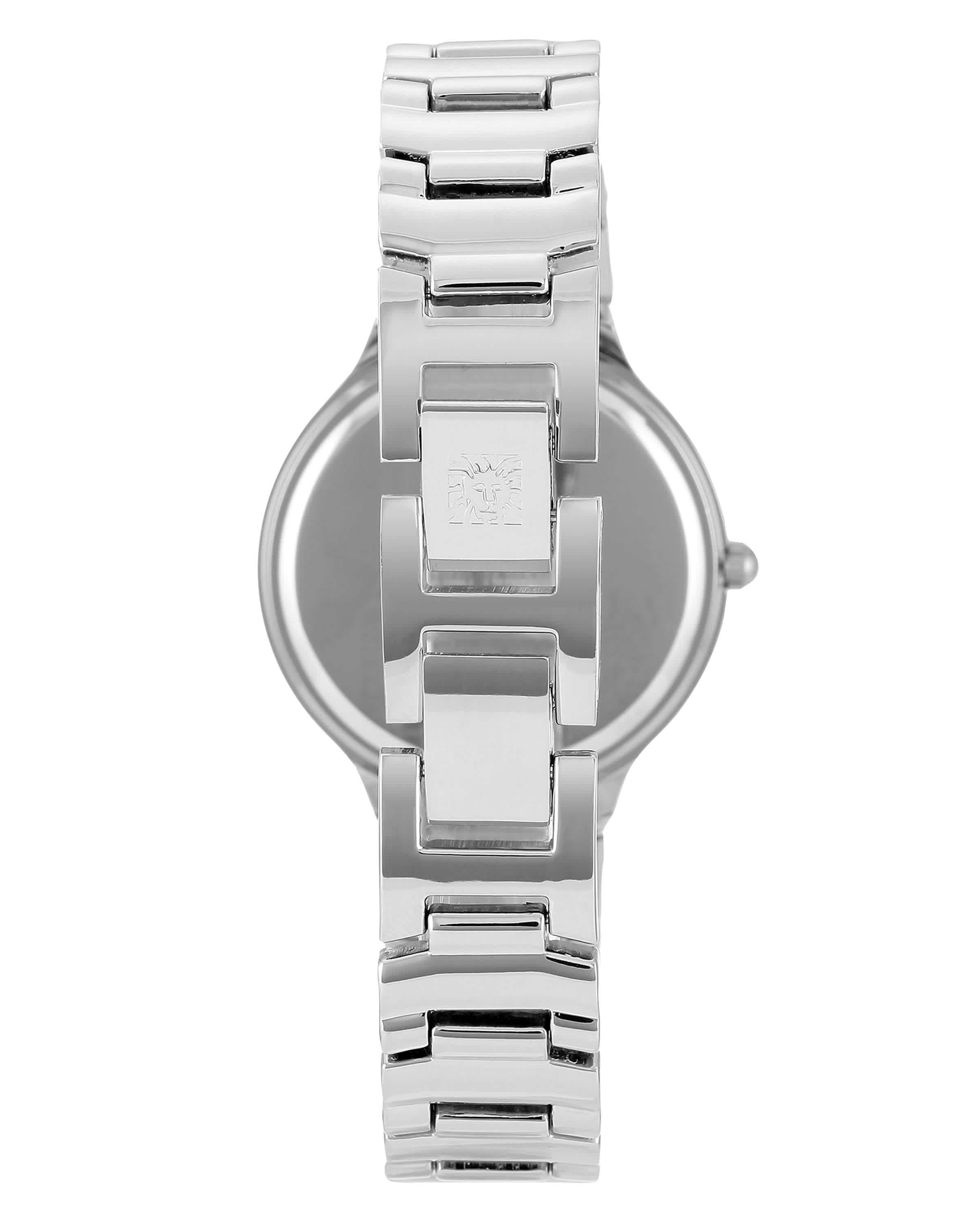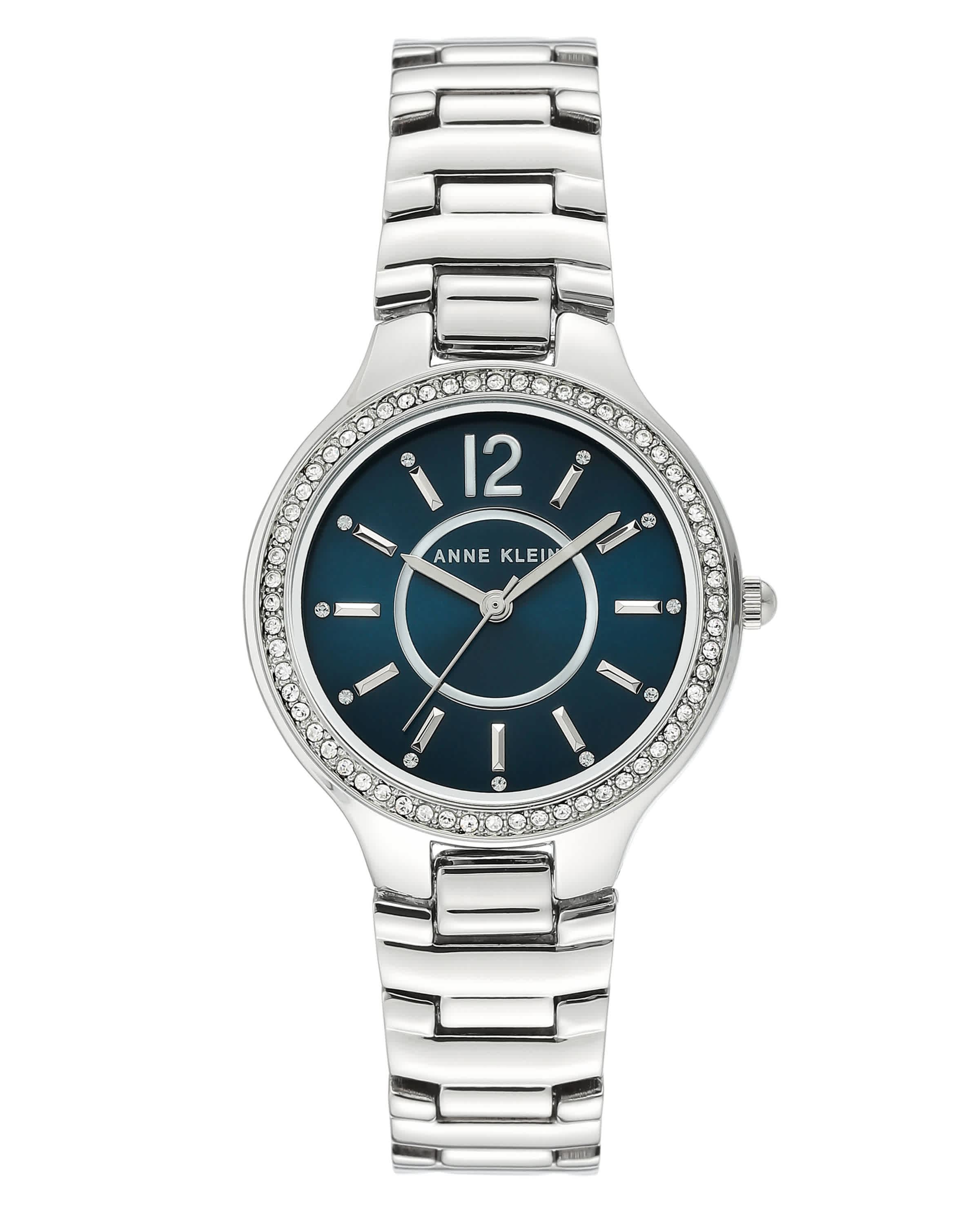 Metal case with a bracelet band. Fixed metal bezel. Navy blue sunray dial with silver-tone hands and index markers, Arabic numerals hour markers. Dial Type: Analog. Japanese quartz movement. Scratch resistant mineral crystal. Pull/push crown. Solid case back. Round case shape, case size: 32mm, case thickness: 7.30mm. Band width: 16x14mm. Jewelry clasp. Water resistant at 100 feet. Functions: hour, minute, second. Anne Klein Navy Blue Sunray Dial Ladies Watch AK/1855NVSV.