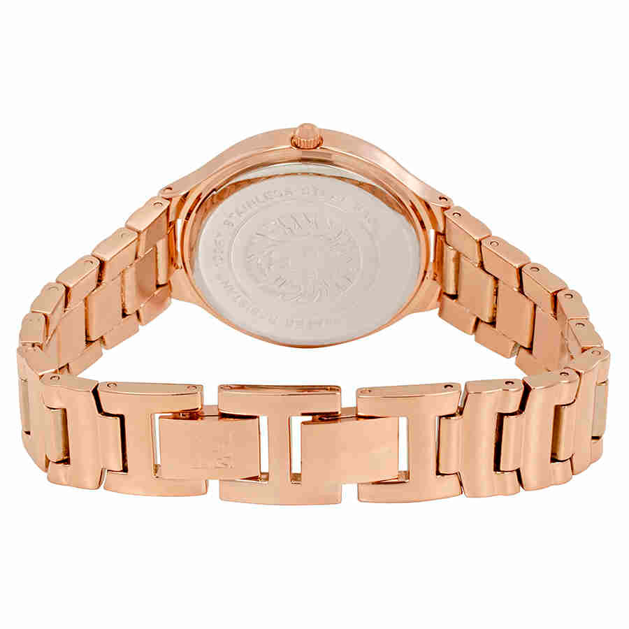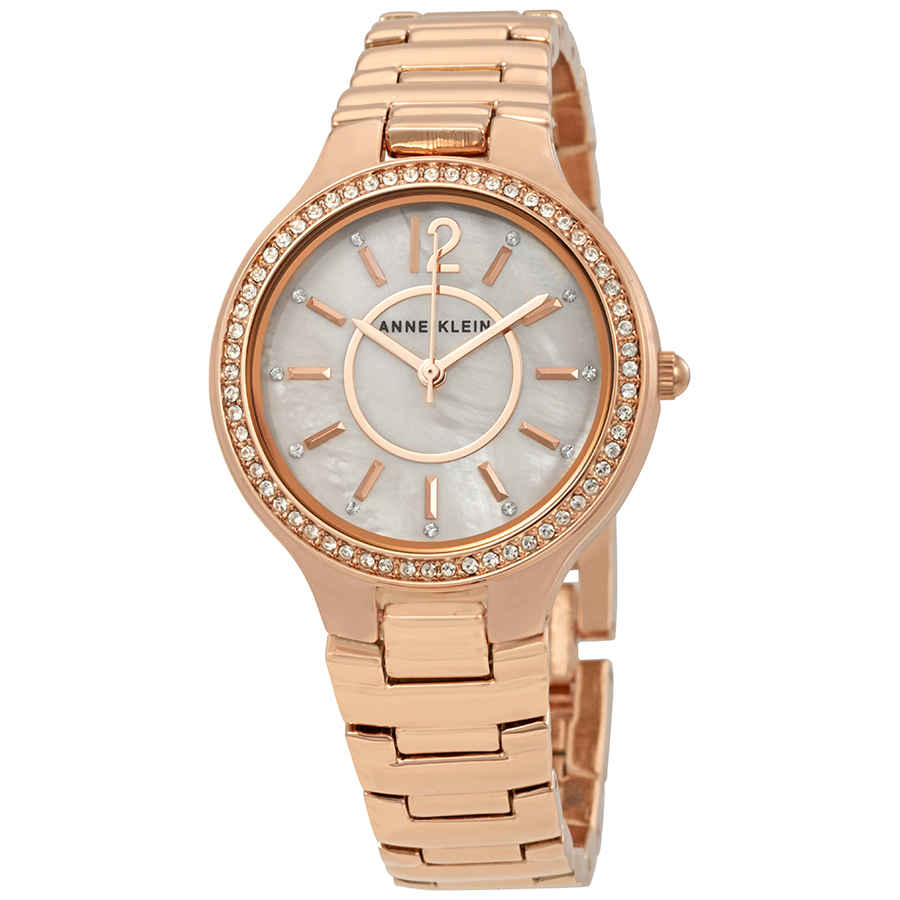 Rose gold-tone metal case with a rose gold-tone metal bracelet. Fixed rose gold-tone metal set with swarovski crystals bezel. Mother of pearl dial with rose gold-tone hands and swarovski crystal-tipped index...