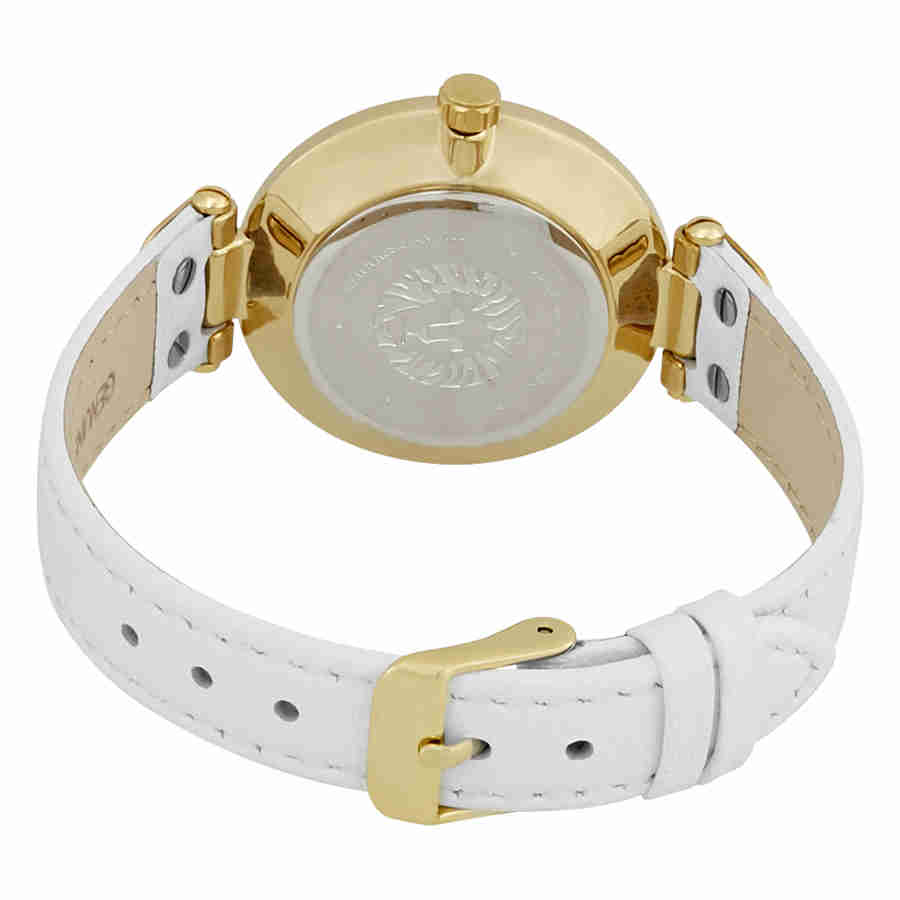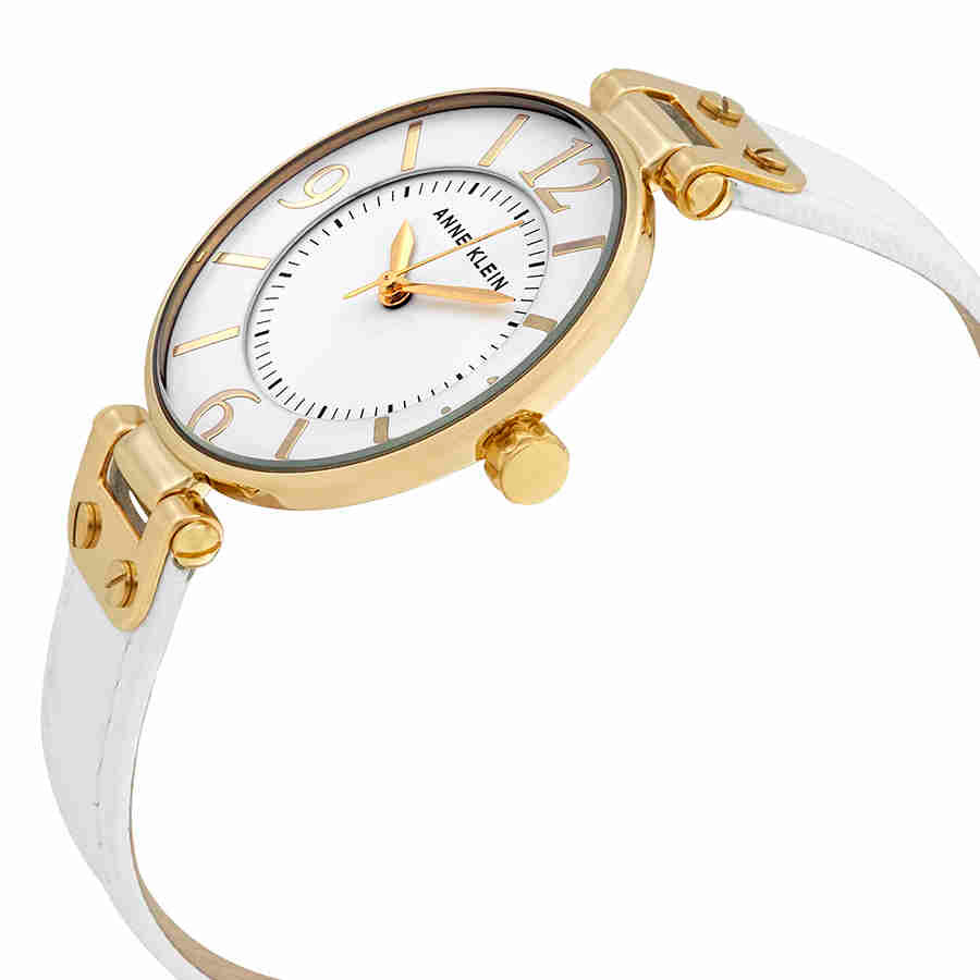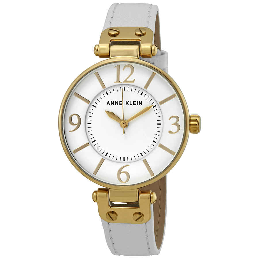 Gold-tone stainless steel case with a white leather strap. Fixed gold-tone bezel. White dial with gold-tone hands and index hour markers. Arabic numerals mark the 3, 6, 9 and 12 o'clock positions. Minute markers around an inner ring. Quartz movement. Scratch resistant mineral crystal. Pull / push crown. Solid case back. Case size: 34 mm. Case thickness: 9 mm. Round case shape. Band width: 14 mm. Tang clasp. Water resistant at 30 meters / 100 feet. Functions: hour, minute, second. Casual watch style. Anne Klein White Dial Ladies Watch 10-9168WTWT.
