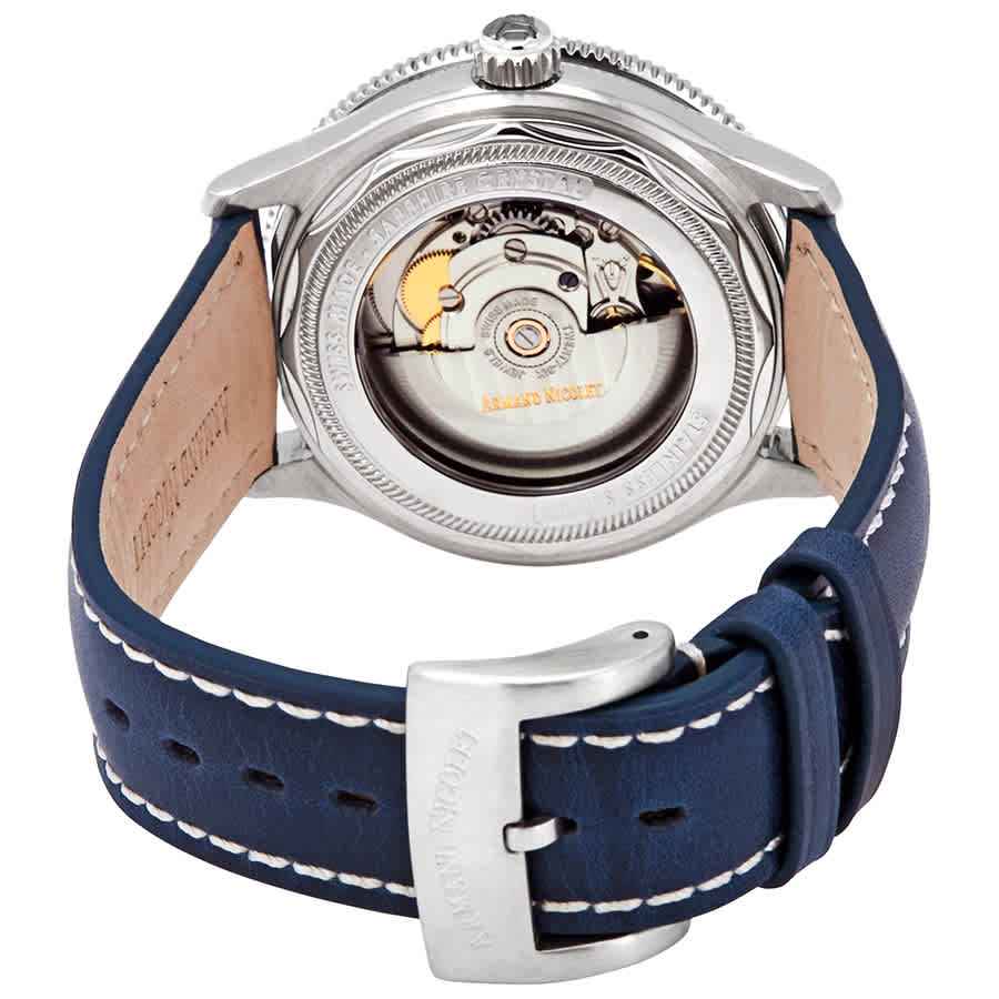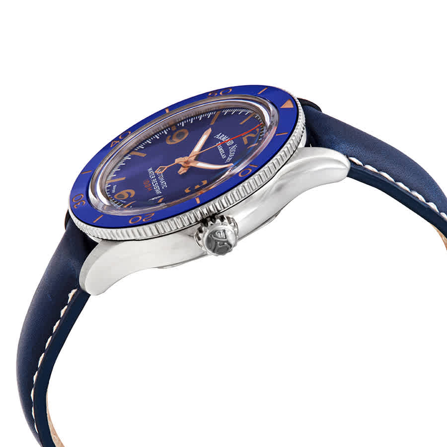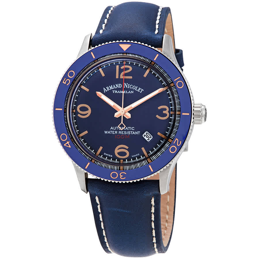 Silver-tone stainless steel case with a blue white stitching leather strap. Rotating blue ceramic bezel. Blue dial with rose gold-tone hands and Arabic numeral and index hour markers. Minute markers around the outer rim. Dial Type: Analog. Luminescent hands. Date display between 4 and 5 o'clock position. Automatic movement. Scratch resistant sapphire crystal. Pull / push crown. Transparent case back. Round case shape. Case size: 42 mm. Band width: 20 mm, band length: 8 inches. Buckle clasp. Water resistant at 100 meters / 330 feet. Functions: date, hour, minute, second. Dress watch style. Watch label: Swiss Made. Armand Nicolet MA2 Automatic Blue Dial Mens Watch A890AUS-BS-P190BU2.