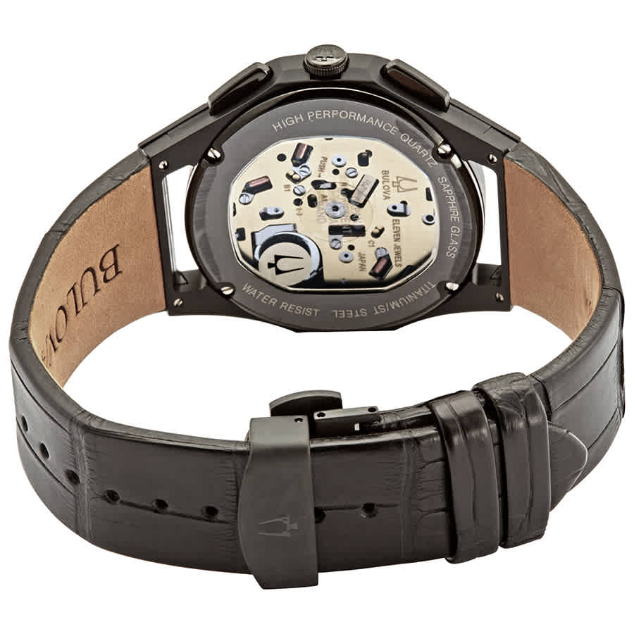 Black IP titanium case with a black alligator leather strap. Fixed bezel. Black dial with black hands and diamonds hour markers. Dial Type: Analog. Quartz movement. Scratch resistant sapphire crystal. Transparent...