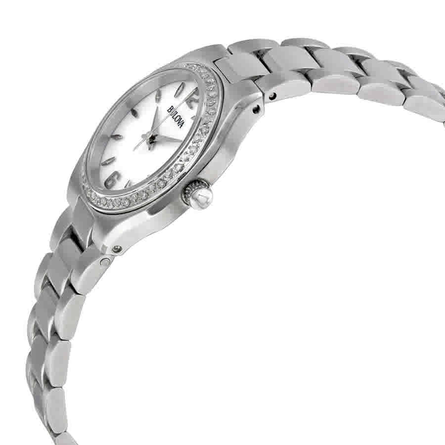 Stainless steel case with a stainless steel bracelet. Fixed stainless steel bezel set with diamonds. Mother of pearl dial with silver-tone hands and index hour markers. Arabic numerals mark the 6 and 12 o'clock positions. Dial Type: Analog. Quartz movement. Scratch resistant sapphire crystal. Pull / push crown. Solid case back. Case diameter: 26 mm. Case thickness: 7 mm. Round case shape. Band width: 15 mm. Deployment clasp. Water resistant at 30 meters / 100 feet. Functions: hour, minute, second. Casual watch style. Bulova Mother of Pearl Dial Stainless Steel Ladies Watch 96R199.