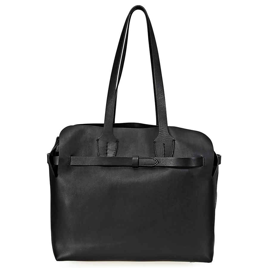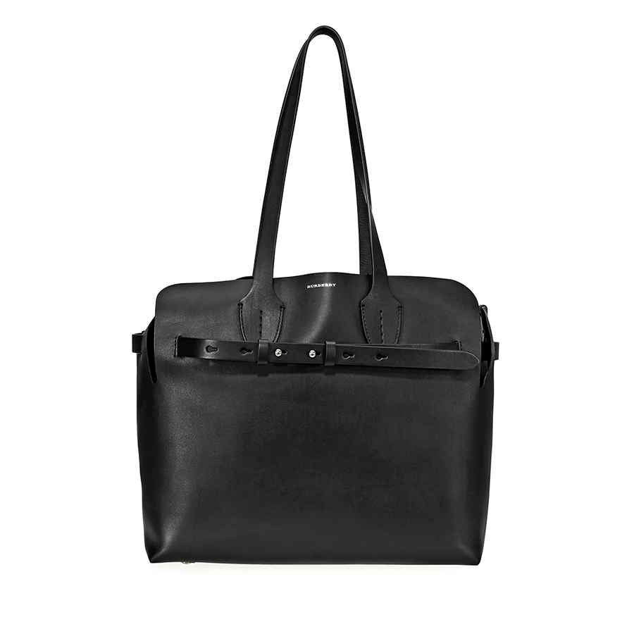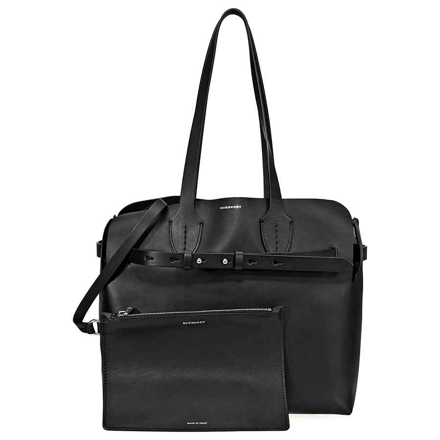 Burberry tote styled in supple leather, with 100% calf leather lining and [olished metal hardware. This tote features 1 main compartment, 2 leather handles with a 10.6" drop, and detachable zip pouch. Dimensions: 13.8 x 5.9 x 12.2". Made in Italy.]