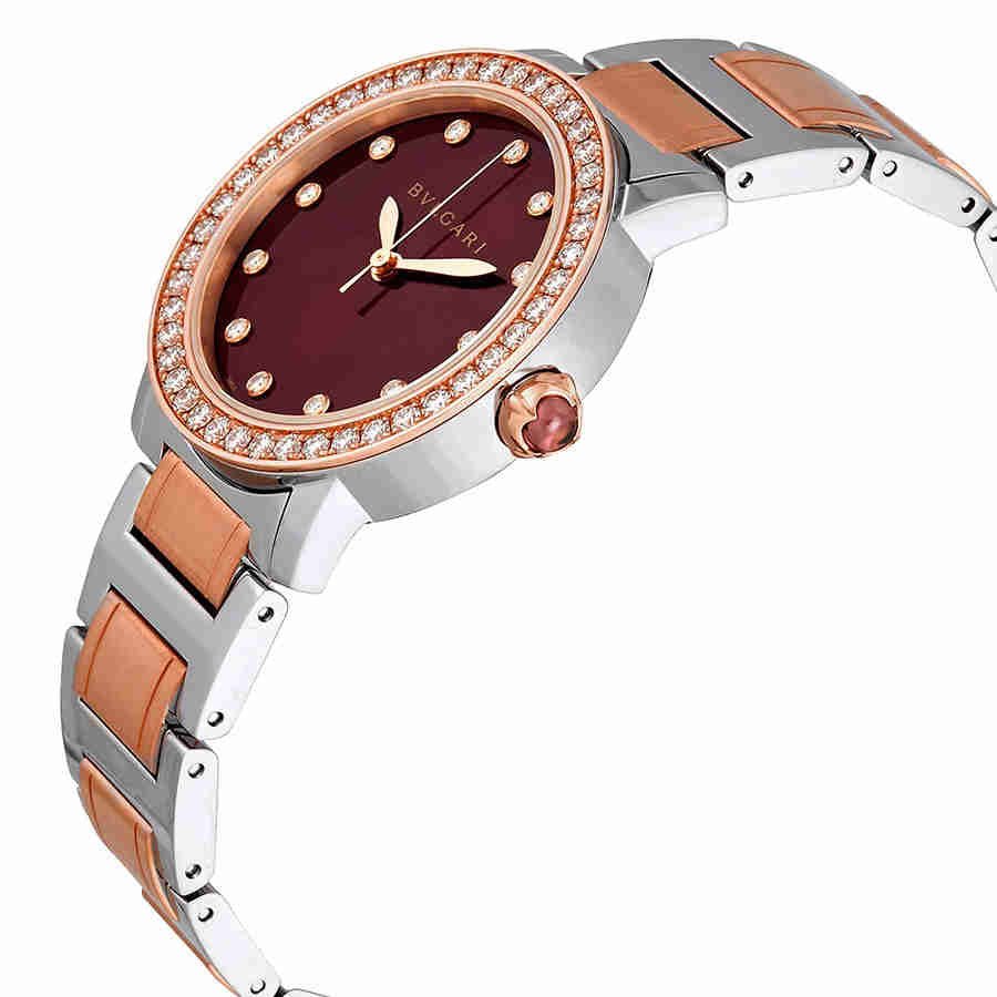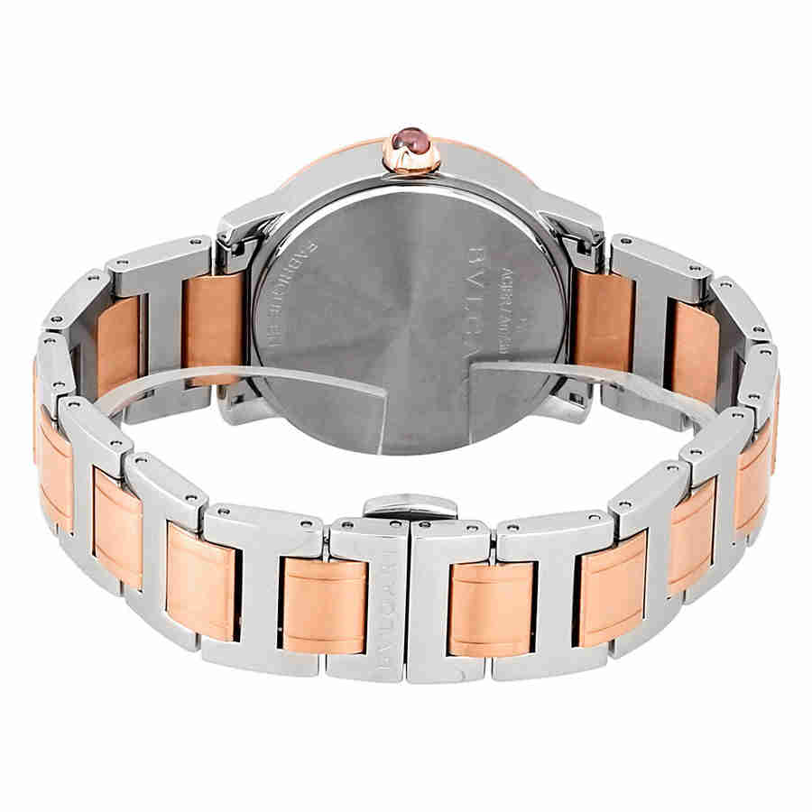 Stainless steel and 18k rose gold case with a stainless steel and 18k rose gold bracelet. Fixed bezel. Brown dial with rose gold-tone hands and diamond hour markers. Dial Type: Analog. Automatic movement. Scratch resistant sapphire crystal. Case size: 33 mm. Round case shape. Deployment clasp. Water resistant at 30 meters / 100 feet. Functions: hour, minute, second. Luxury watch style. Watch label: Swiss Made. Bvlgari Bvlgari Brown Dial Diamond Automatic Ladies Watch 102478.