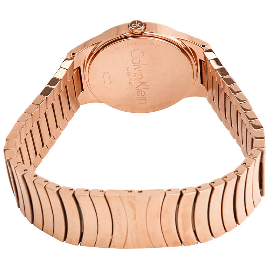 Rose gold-tone stainless steel case and bracelet. Fixed rose gold-tone bezel. Silver dial with rose gold-tone hands. No markers. Quartz movement. Scratch resistant mineral crystal. Pull / push crown. Solid case...