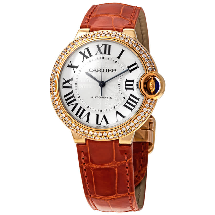 18kt yellow gold case with a orange leather strap. Fixed diamond set bezel. Guilloche dial with blued-steel sword-shaped hands and Roman numeral hour markers. Dial Type: Analog. Cartier Calibre 076 automatic movement with a 38-hour power reserve. Scratch resistant sapphire crystal. Solid case back. Round case shape, case size: 36.6 mm, case thickness: 12 mm. Deployment with push button release clasp. Water resistant at 30 meters / 100 feet. Functions: hour, minute, second. Additional Info: crown set with a synthetic blue cabochon. Luxury watch style. Watch label: Swiss Made. Cartier Ballon Bleu Automatic 18kt Yellow Gold Diamond Ladies Watch WE900451.