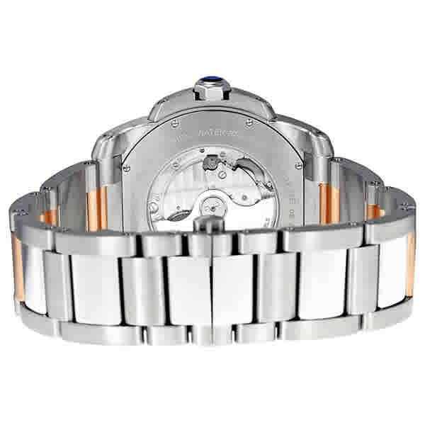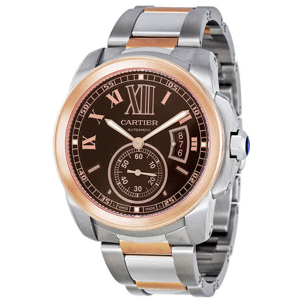 Silver-tone stainless steel case with a two-tone (silver-tone and pink gold-tone) stainless steel and 18kt pink gold bracelet. Fixed 18kt pink gold bezel. Chocolate brown dial with luminous hands and Roman numeral hour markers. Minute markers around the outer rim. Dial Type: Analog. Luminescent hands and markers. Date display at the 3 o'clock position. Small seconds subdials. Cartier Calibre 1940-PS MC automatic movement with a 48-hour power reserve. Scratch resistant sapphire crystal. Faceted set with a blue synthetic spinel crown. Solid case back. Round case shape, case size: 42 mm, case thickness: 10 mm. Deployment clasp. Water resistant at 30 meters / 100 feet. Functions: date, hour, minute, second. Luxury watch style. Watch label: Swiss Made. Cartier Calibre De Cartier Chocolate Brown Dial Mens Watch W7100050.