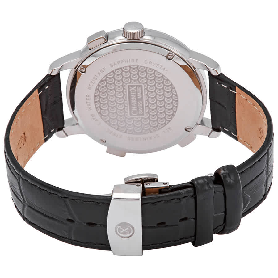 Silver-tone stainless steel case with a black leather strap. Fixed silver-tone stainless steel bezel. Blue dial with silver-tone hands and Roman numeral hour markers. Minute markers around the outer rim. Dial Type: Analog. Date display at the 3 o'clock position. Four - date, day. month, moonphase subdials. Ronda Caliber 706.3 quartz movement. Scratch resistant sapphire crystal. Solid case back. Round case shape, case size: 42 mm, case thickness: 8.4 mm. Band width: 20 mm. Deployment clasp. Water resistant at 50 meters / 165 feet. Functions: full calendar, moon phase, month, date, day, hour, minute, second. Casual watch style. Watch label: Swiss Movt. Charmex Wildenstein Blue Dial Complete Calendar Mens Watch 3067.