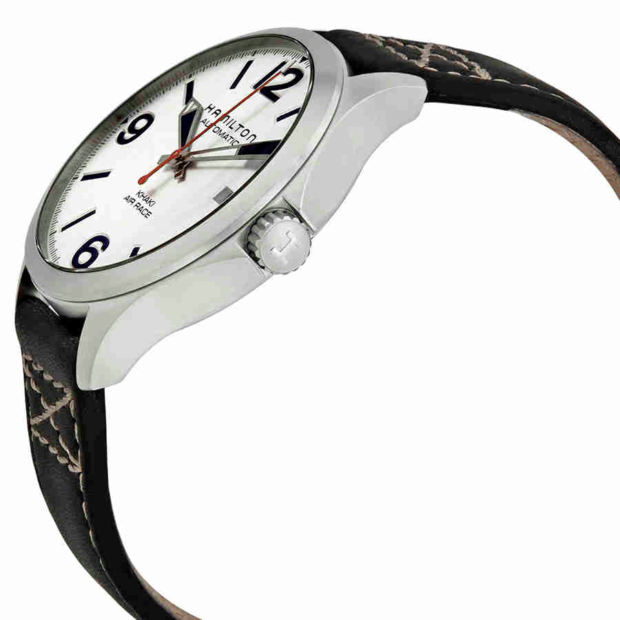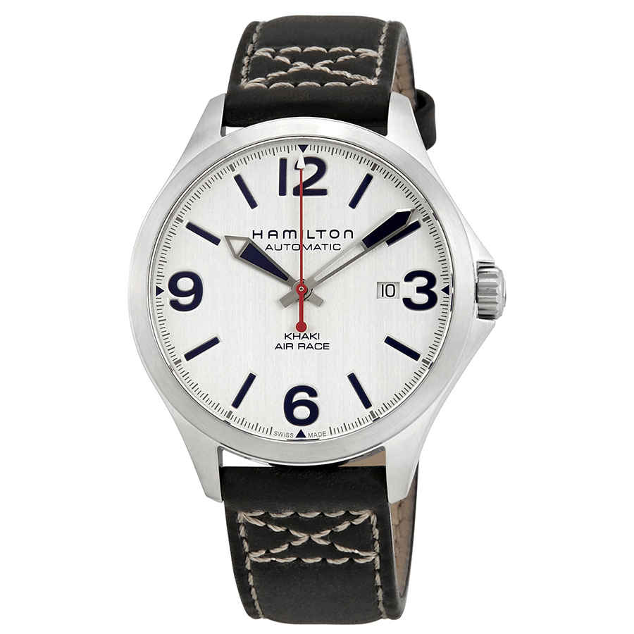 Stainless steel case with a black leather strap. Fixed stainless steel bezel. Silver dial with luminous silver-tone hands and index hour markers. Arabic numerals mark the 3, 6, 9 and 12 o'clock positions. Minute markers around the outer rim. Dial Type: Analog. Luminescent hands. Date display at the 3 o'clock position. Hamilton calibre H-10 automatic movement with an 80-hour power reserve. Scratch resistant sapphire crystal. Transparent case back. Round case shape. Case size: 42 mm. Case thickness: 11 mm. Band width: 20 mm. Tang clasp. Water resistant at 50 meters / 165 feet. Functions: date, hour, minute, second. Casual watch style. Watch label: Swiss Made. Hamilton Khaki Aviation Air Race Silver Dial Mens Leather Watch H76525751.