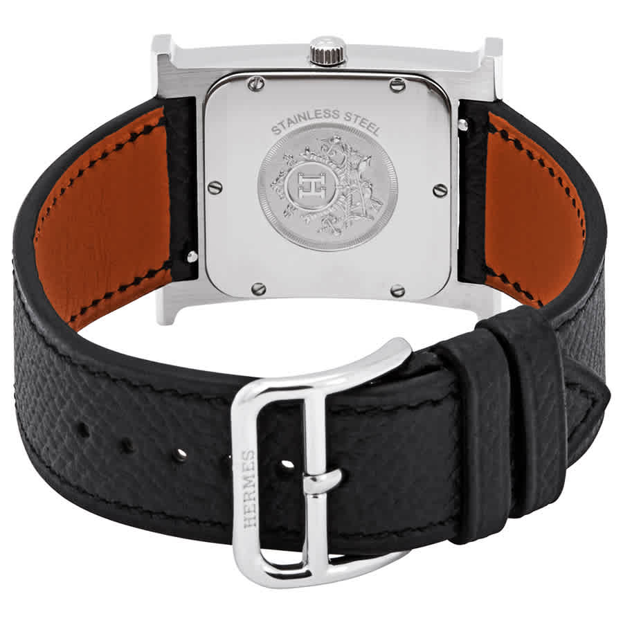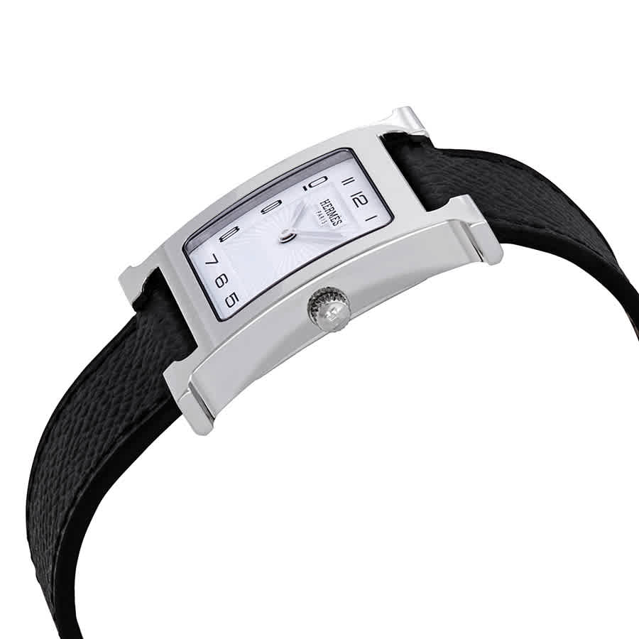 Silver-tone stainless steel case with a black leather strap. Fixed silver-tone stainless steel bezel. White dial with silver-tone hands and Arabic numeral hour markers. Dial Type: Analog. Quartz movement. Scratch resistant sapphire crystal. Pull / push crown. Solid case back. Rectangle case shape. Case size: 26 mm x 26 mm. Band length: 5.9" - 6.9". Buckle clasp. Water resistant at 30 meters / 100 feet. Functions: hour, minute. Dress watch style. Watch label: Swiss Made. Hermes Heure H White Dial Ladies Meduim Black Leather Watch 036792WW00.