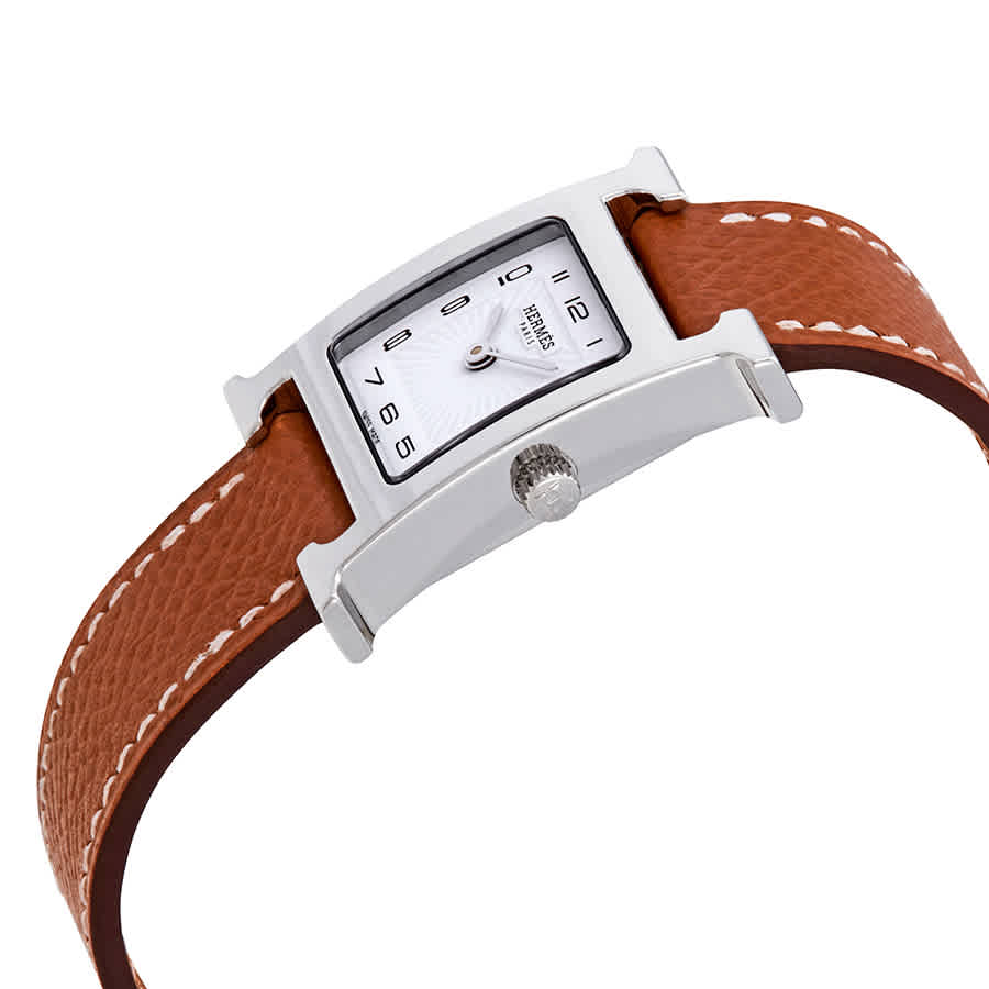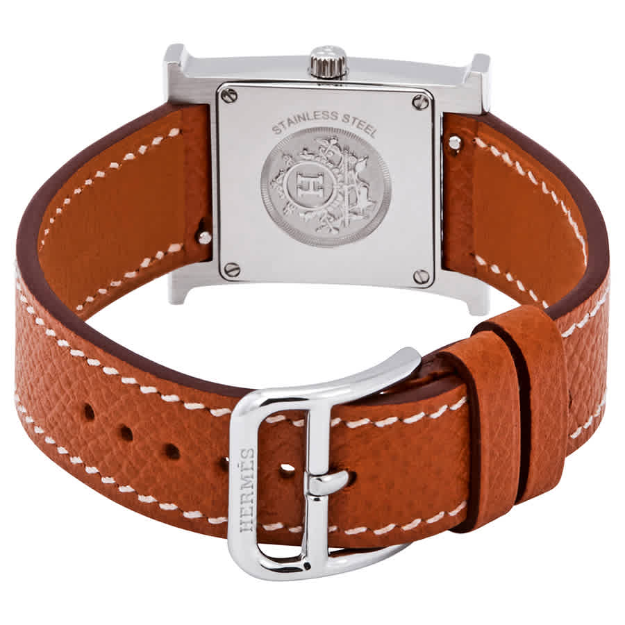 Silver-tone stainless steel case with a brown gold grained calfskin leather strap. Fixed silver-tone stainless steel bezel. White dial with silver-tone hands and Arabic numeral hour markers. Dial Type: Analog. Quartz movement. Scratch resistant sapphire crystal. Pull / push crown. Solid case back. Square case shape. Case size: 21 mm x 21 mm. Buckle clasp. Water resistant at 30 meters / 100 feet. Functions: hour, minute. Casual watch style. Watch label: Swiss Made. Hermes Heure H White Dial Small Ladies Watch 036702WW00.