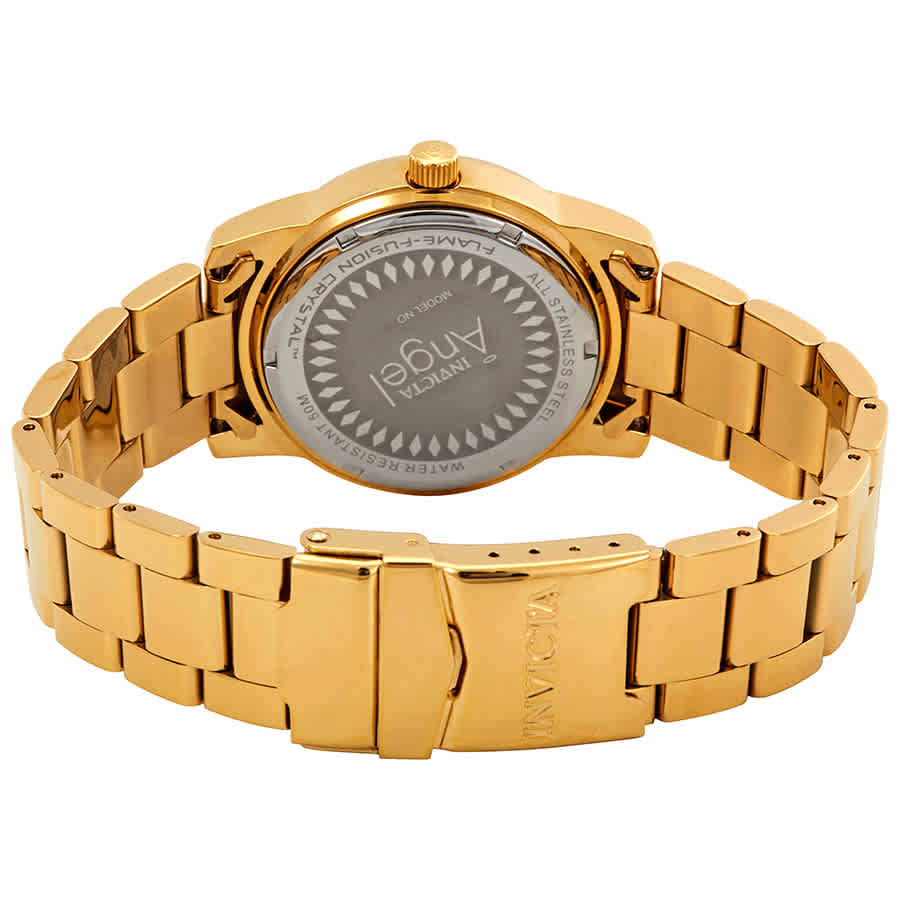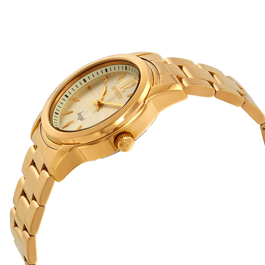 Yellow gold-plated stainless steel case and bracelet. Fixed yellow gold-plated bezel. Champagne dial with yellow gold-tone hands and index hour markers. An Arabic numeral marks the 12 o'clock position. Minute markers around the outer rim. Dial Type: Analog. ISA caliber 638/101 quartz movement. Scratch resistant flame fusion crystal. Pull / push crown. Solid case back. Round case shape. Case size: 38 mm. Case thickness: 11 mm. Band width: 20 mm, band length: 8 inches. Fold over with safety release clasp. Water resistant at 50 meters / 165 feet. Functions: hour, minute, second. Casual watch style. Invicta Angel Dial Gold-plated Ladies Watch 17420.