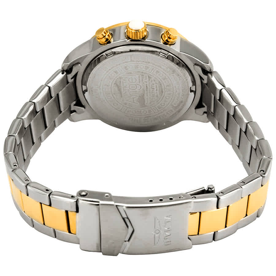Stainless steel case with a two-tone (silver and yellow gold-plated) stainless steel bracelet. Fixed yellow gold-plated bezel. Mother of pearl dial with yellow gold-tone hands and index hour markers. An Arabic numeral appears at the 12 o'clock position. Minute markers around the outer rim. Dial Type: Analog. Luminescent hands and markers. Three multi-function sub-dials displaying: date, day of the week, and 24 hours. Quartz movement. Scratch resistant flame fusion crystal. Pull / push crown set with a white cabochon. Solid case back. Case diameter: 38 mm. Case thickness: 12 mm. Round case shape. Band width: 18 mm. Band length: 8 inches. Fold over clasp with a safety release. Water resistant at 100 meters / 330 feet. Functions: date, day, hour, minute, second. Casual watch style.Invicta Angel Mother of Pearl Dial Two-tone Ladies Watch 21613