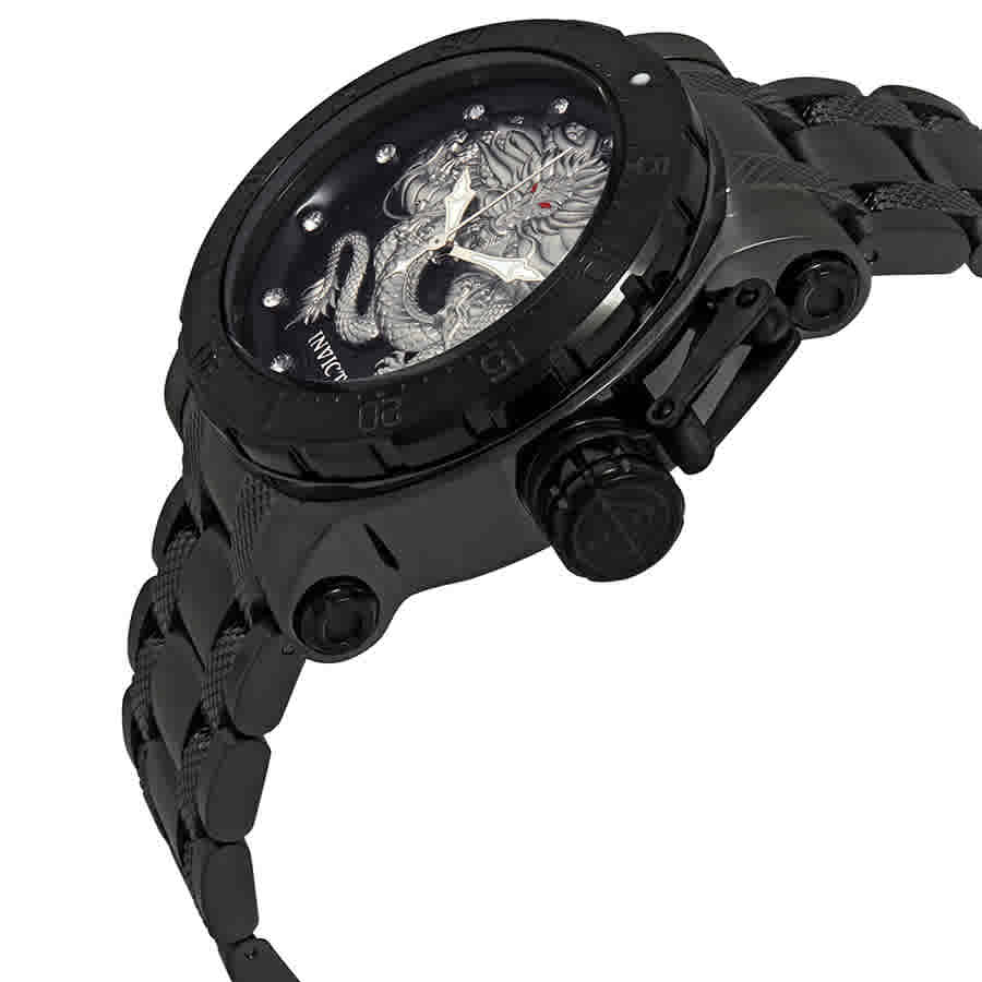 Black ion-plated stainless steel case with a black ion-plated stainless steel bracelet. Uni-directional rotating black ion-plated stainless steel bezel. Black and silver (dragon) dial with luminous silver-tone hands and crystal hour...