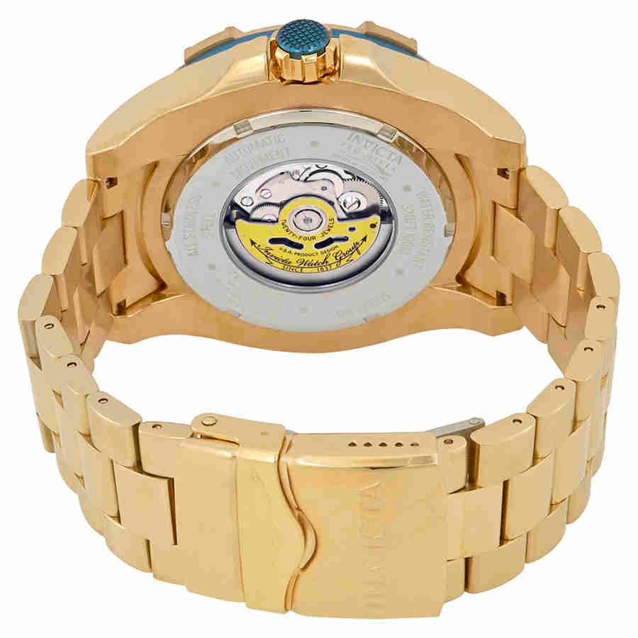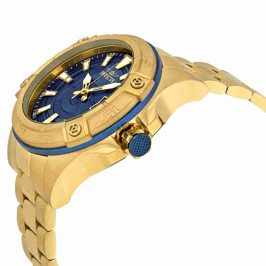 Gold-tone stainless steel case with a gold-tone stainless steel bracelet. Uni-directional rotating gold-tone stainless steel bezel. Blue dial with gold-tone hands and index hour markers. Minute markers around the outer rim....