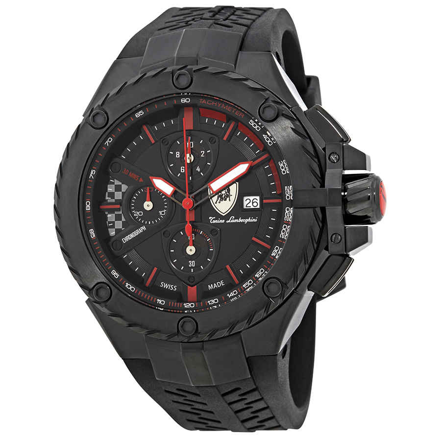 Black PVD stainless steel case with a black rubber strap. Black PVD bezel. Black dial with luminous red hands and index hour markers. Minute markers. Tachymeter markings around the outer rim. Dial Type: Analog. Luminescent hands. Date display at the 3 o'clock position. Chronograph - three sub-dials displaying: 60 second, 30 minute and 10 hours. Ronda RL 3540.D quartz movement. Scratch resistant mineral sapphire coated glass crystal. Case size: 54 mm. Round case shape. Water resistant at 100 meters / 330 feet. Functions: chronograph, date, hour, minute, second. Lamborghini Tyre Black Dial Mens Chronograph Rubber Watch 03.