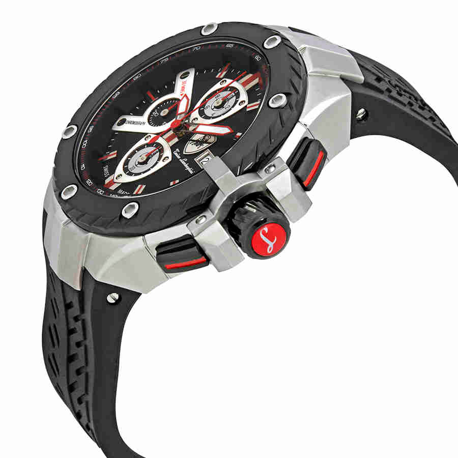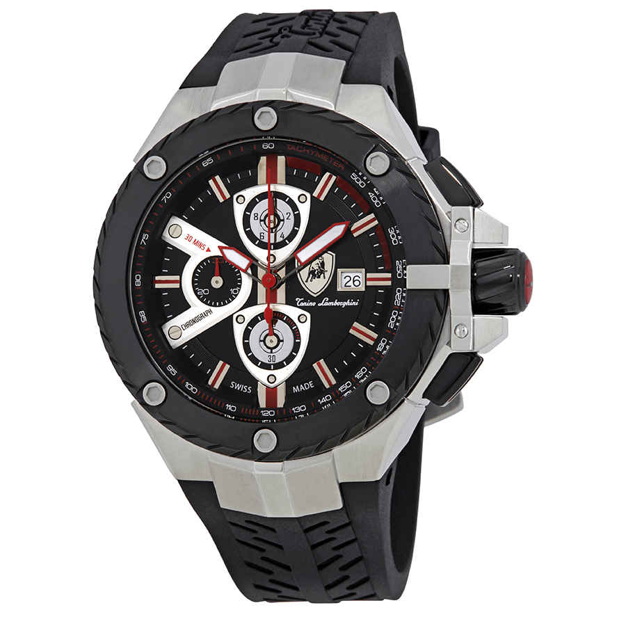 Stainless steel case with a black rubber strap. Fixed black PVD bezel. Black dial with luminous red hands and index hour markers. Minute markers. Tachymeter markings around the out. Dial Type: Analog. Luminescent hands and markers. Date display at the 3 o'clock position. Chronograph - three sub-dials displaying: 60 second, 30 minute and 12 hour. Quartz movement. Scratch resistant mineral crystal. Solid case back. Case size: 45 mm. Round case shape. Tang clasp. Water resistant at 100 meters / 330 feet. Functions: chronograph, tachymeter, date, hour, minute, second. Sport watch style. Watch label: Swiss Made. Lamborghini Tyre Chronograph Black Dial Mens Watch TYRE 02.