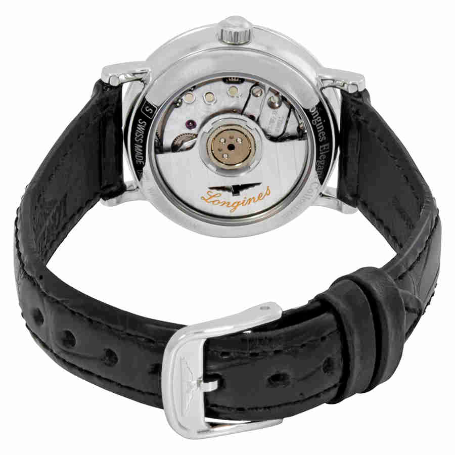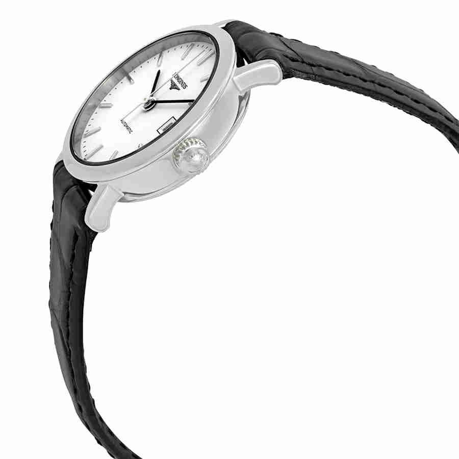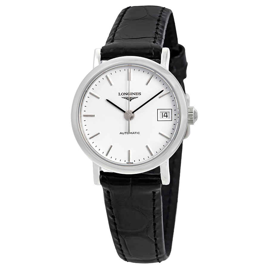 Stainless steel case with a black leather strap. Fixed stainless steel bezel. White dial with black hands and index hour markers. Minute markers around the outer rim. Dial Type: Analog. Date display at the 3 o'clock position. Longines calibre L595 automatic movement with a 40-hour power reserve. Scratch resistant sapphire crystal. Pull / push crown. Solid case back. Round case shape, case size: 25.5 mm, case thickness: 8 mm. Band width: 13 mm. Tang clasp. Water resistant at 30 meters / 100 feet. Functions: date, hour, minute, second. Dress watch style. Watch label: Swiss Made. Longines Elegant Automatic White Dial Ladies Watch L4.309.4.12.2.