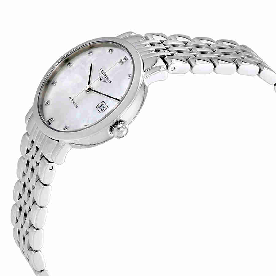 Stainless steel case with a stainless steel bracelet. Fixed stainless steel bezel. Mother of pearl dial with steel hands and wesselton diamond hour markers. Dial Type: Analog. Date display at the 3 o'clock position. Longines calibre 595/592 automatic movement with a 40-hour power reserve. Scratch resistant sapphire crystal. Pull / push crown. Transparent case back. Case size: 29 mm. Round case shape. Band width: 14 mm. Fold over deployment clasp. Water resistant at 30 meters / 100 feet. Functions: date, hour, minute, second. Luxury watch style. Watch label: Swiss Made. Longines Elegant Mother of Pearl Dial Ladies Watch L43104876.