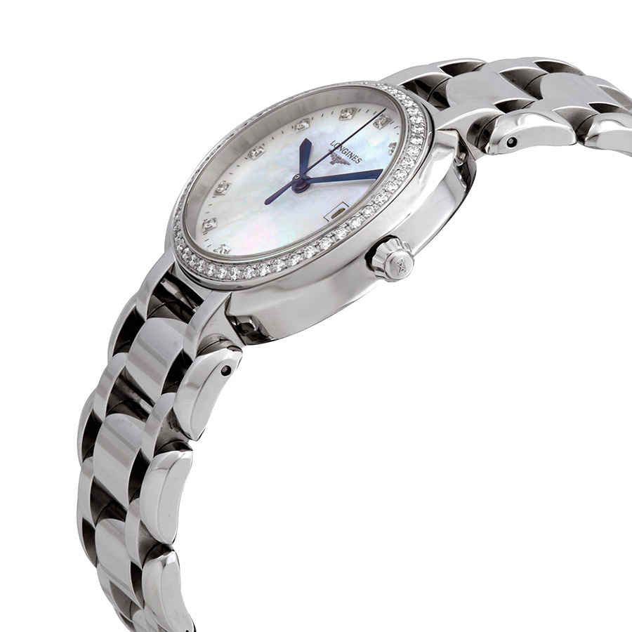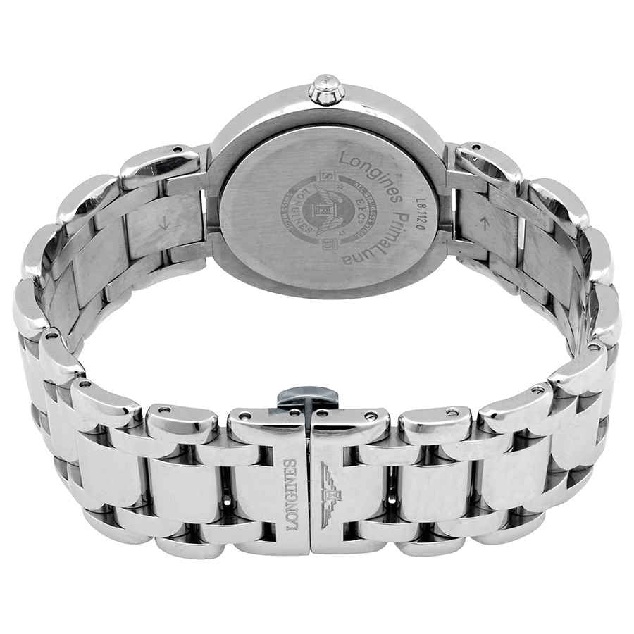 Stainless steel case with a stainless steel bracelet. Fixed stainless steel bezel. White dial with silver-tone hands and index hour markers. Arabic numerals mark the 6 and 12 o'clock positions. Minute markers around the outer rim. Dial Type: Analog. Date display at the 3 o'clock position. Longines calibre L250 quartz movement. Scratch resistant sapphire crystal. Pull / push crown. Solid case back. Round case shape. Case size: 30 mm. Case thickness: 8 mm. Band width: 20 mm. Hidden fold over clasp. Water resistant at 30 meters / 100 feet. Functions: date, hour, minute, second. Dress watch style. Watch label: Swiss Made. Item Variations: L8 110 4 16 6, L8-110-4-16-6, L8/110/4/16/6, L81104166. Longines Primaluna Quartz White Dial Ladies Watch L8.110.4.16.6.