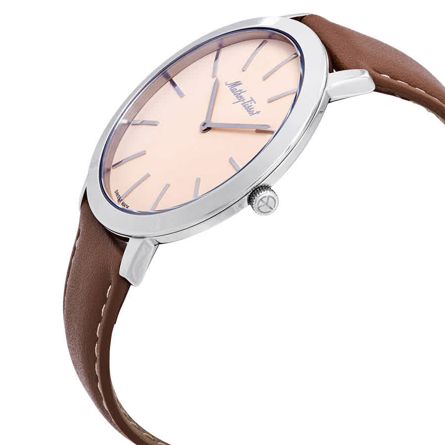 Silver-tone stainless steel case with a brown leather strap. Fixed silver-tone stainless steel bezel. Creme beige dial with silver-tone hands and index hour markers. Dial Type: Analog. Ronda Caliber 762 quartz movement. Scratch resistant sapphire glass crystal. Pull / push crown. Solid case back. Round case shape, case size: 42 mm, case thickness: 8 mm. Buckle clasp. Water resistant at 50 meters / 165 feet. Functions: hour, minute. Casual watch style. Watch label: Swiss Movt. Mathey-Tissot Darius Beige Dial Mens Watch H7915AIS.