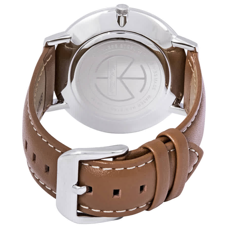 Silver-tone stainless steel case with a brown leather strap. Fixed silver-tone stainless steel bezel. Creme beige dial with silver-tone hands and index hour markers. Dial Type: Analog. Ronda Caliber 762 quartz...