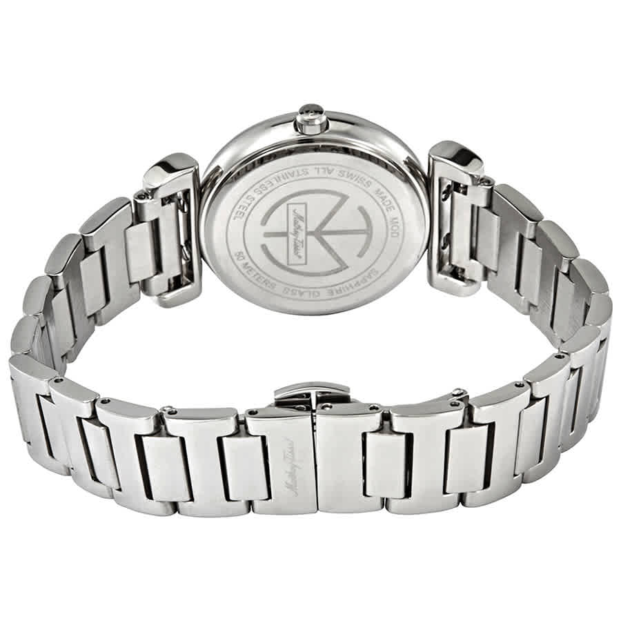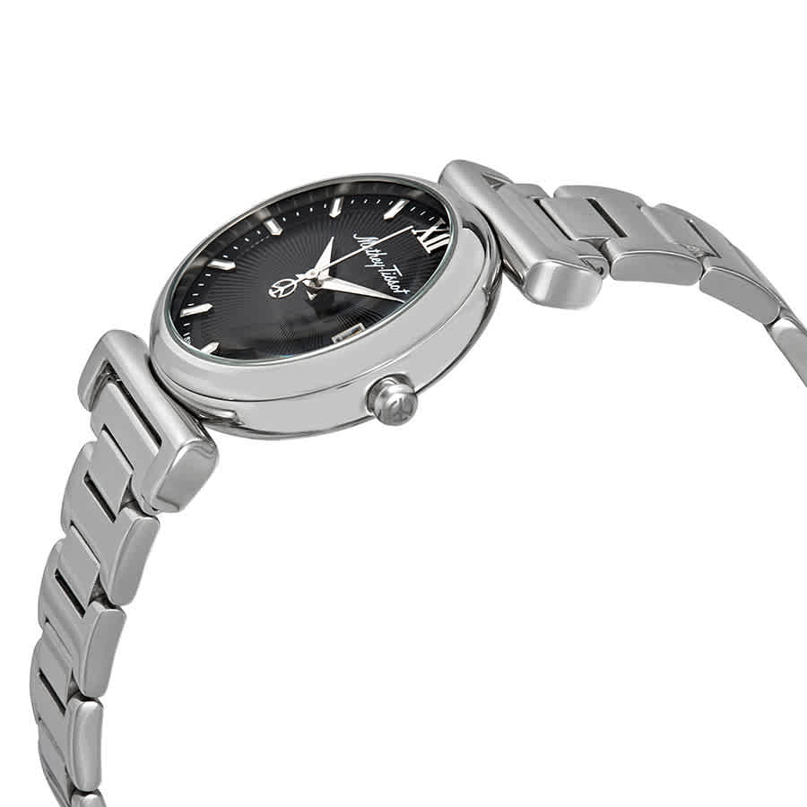 Silver-tone stainless steel case with a silver-tone stainless steel bracelet. Fixed silver-tone stainless steel bezel. Black dial with luminous silver-tone hands and index hour markers. Roman numeral appears at the 12...