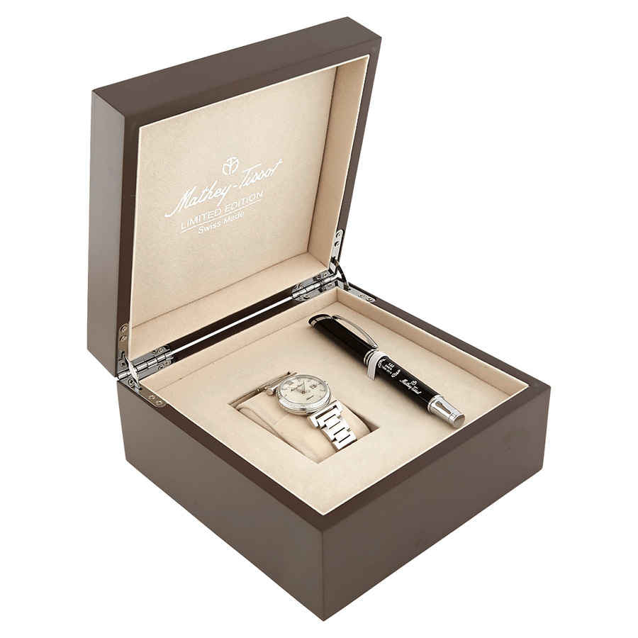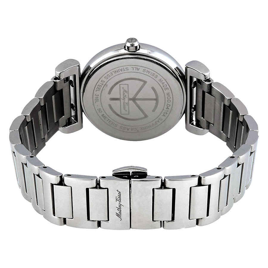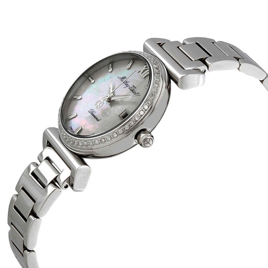 Stainless steel case with a stainless steel bracelet. Fixed stainless steel bezel set with 52 diamonds. Mother of pearl dial with luminous silver-tone hands and index hour markers. Roman numeral appears at the 12 o'clock position. Dial Type: Analog. Luminescent hands and markers. Date display at the 3 o'clock position. Ronda caliber 505 quartz movement. Scratch resistant sapphire crystal. Pull / push crown. Solid case back. Round case shape. Case size: 32 mm. Case thickness: 8 mm. Band width: 14 mm. Deployment clasp. Water resistant at 50 meters / 165 feet. Functions: date, hour, minute, second. Additional Info: diamond set bezel: 52 diamonds hsi 0,3 ct. Luxury watch style. Watch label: Swiss Made. Mathey-Tissot Elegance Diamonds Ladies Watch D410SAI.