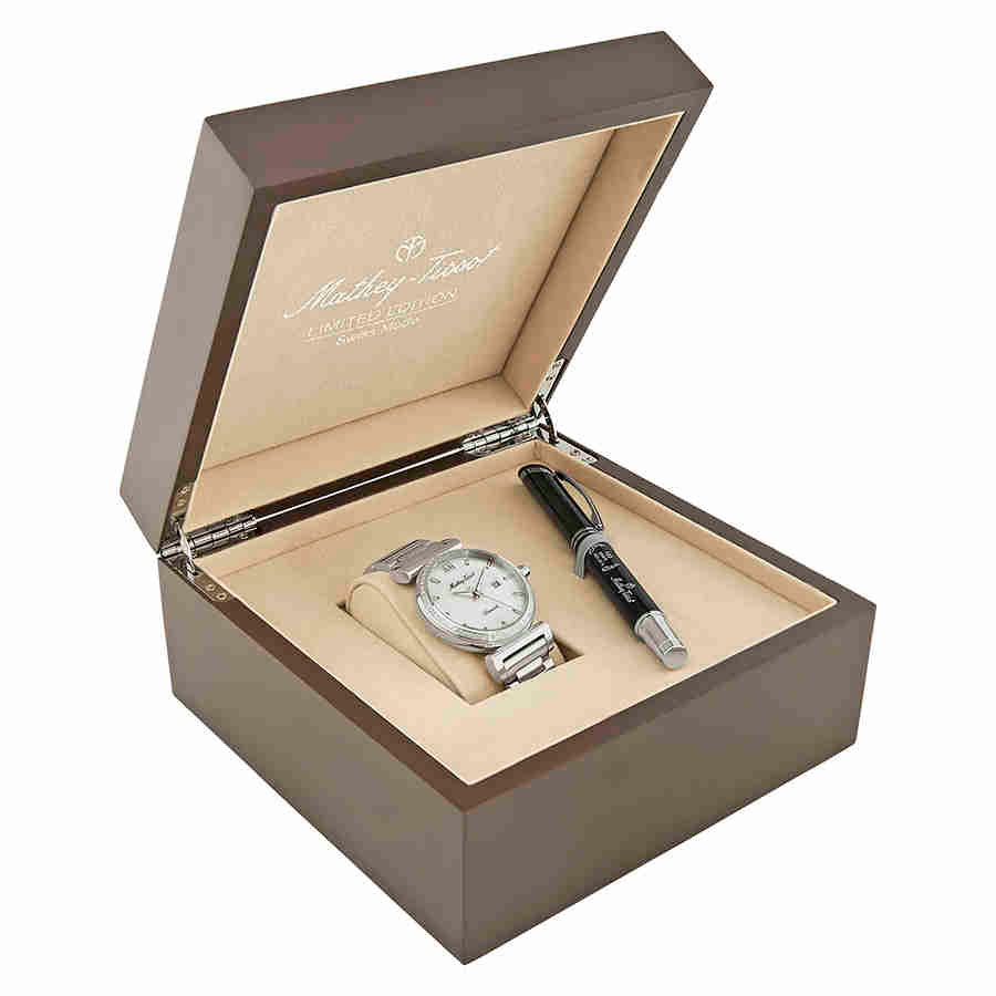 Silver-tone stainless steel case with a silver-tone stainless steel bracelet. Fixed silver-tone diamond set bezel. Mother of pearl dial with silver-tone hands and index hour markers. Dial Type: Analog. Date display...