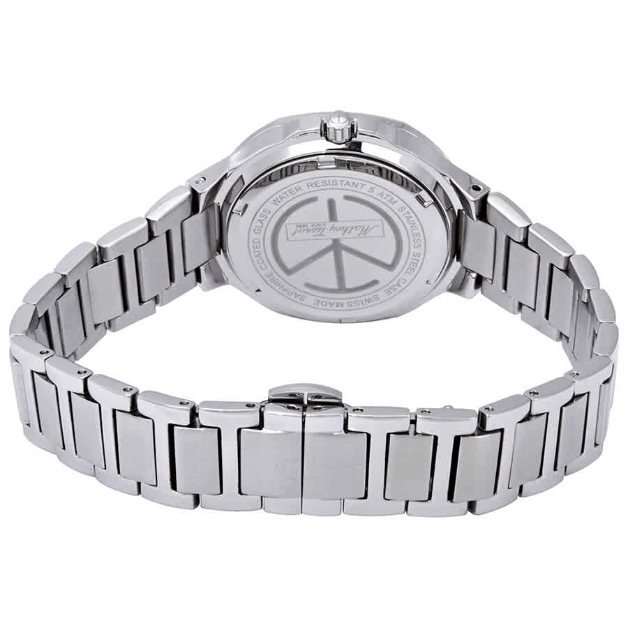 Silver-tone stainless steel case with a silver-tone stainless steel bracelet. Fixed silver-tone stainless steel bezel. Black dial with silver-tone hands and index hour markers. Dial Type: Analog. Date display at the...