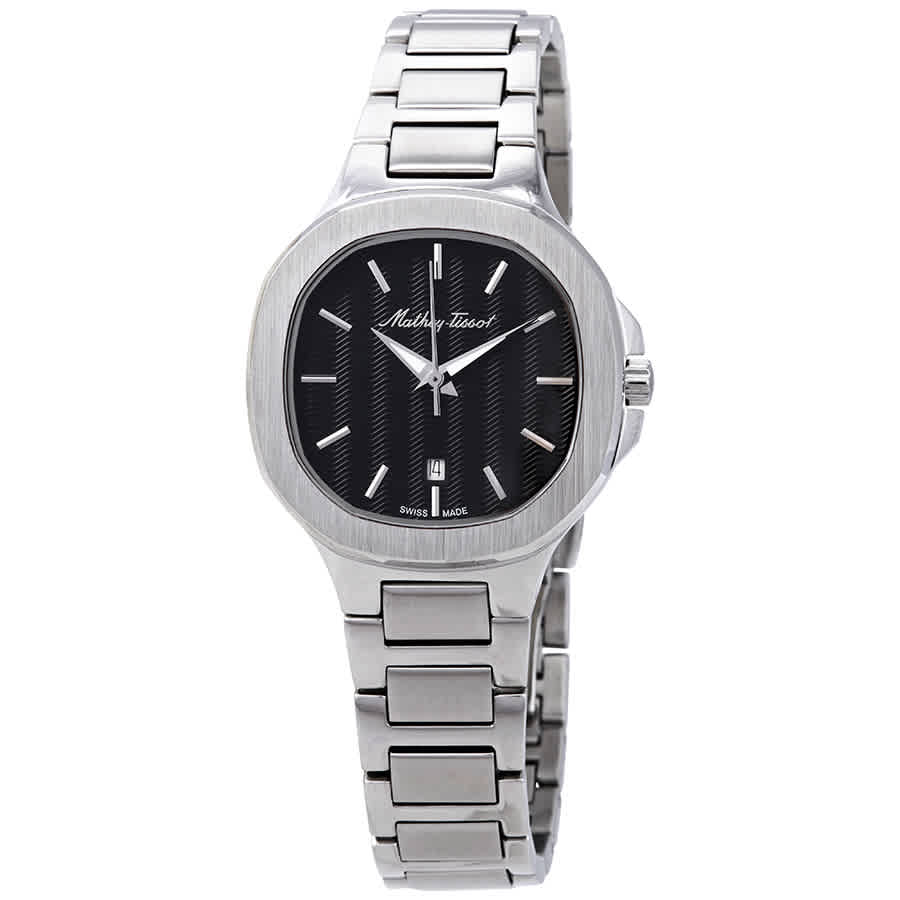 Silver-tone stainless steel case with a silver-tone stainless steel bracelet. Fixed silver-tone stainless steel bezel. Black dial with silver-tone hands and index hour markers. Dial Type: Analog. Date display at the 6 o'clock position. Ronda Caliber 585 quartz movement. Scratch resistant sapphire coated glass crystal. Pull / push crown. Solid case back. Round case shape, case size: 32 mm, case thickness: 8 mm. Water resistant at 50 meters / 165 feet. Functions: date, hour, minute, second. Casual watch style. Watch label: Swiss Made. Mathey-Tissot Evasion Black Dial Ladies Watch D152AN.
