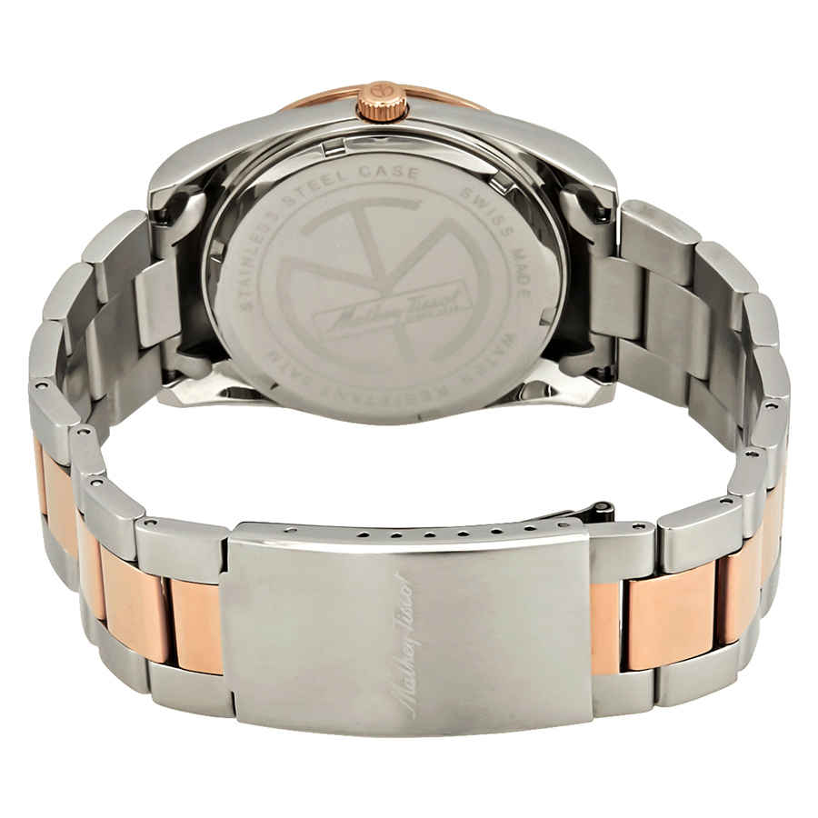 Stainless steel case with a two-tone (silver-tone and rose gold PVD) stainless steel bracelet. Fixed rose gold PVD bezel. Black dial with luminous rose gold-tone hands and index hour markers. Minute markers around the outer rim. Dial Type: Analog. Luminescent hands and markers. Date display at the 3 o'clock position. Ronda caliber 505 quartz movement. Scratch resistant sapphire glass crystal. Pull / push crown. Solid case back. Round case shape. Case size: 40 mm. Case thickness: 11 mm. Band width: 20 mm. Fold over clasp with a safety release. Water resistant at 50 meters / 165 feet. Functions: date, hour, minute, second. Casual watch style. Watch label: Swiss Movt. Mathey-Tissot Rolly I Black Dial Two-tone Mens Watch H450RN.