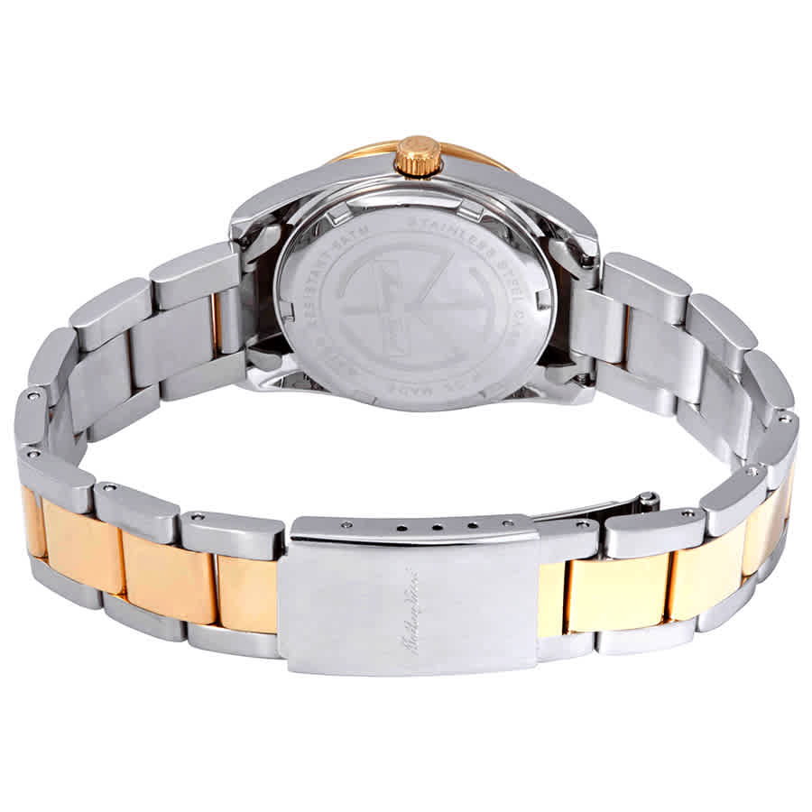 Silver-tone gold-plated stainless steel case with a two-tone (silver-tone and yellow gold-plated) stainless steel bracelet. Fixed yellow gold-plated stainless steel bezel. White dial with gold-tone hands and index hour markers. Minute...