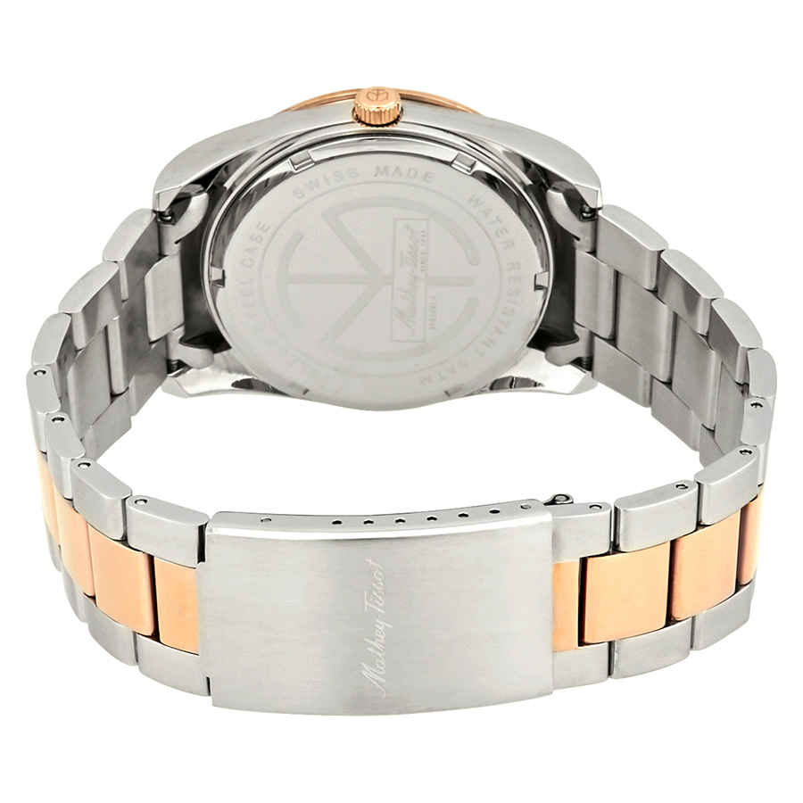 Silver-tone stainless steel case with a two-tone (silver-tone and rose gold-plated) stainless steel bracelet. Fixed rose gold-plated stainless steel bezel. White dial with rose gold-tone hands and index hour markers. Minute markers around the outer rim. Dial Type: Analog. Luminescent hands and markers. Date display at the 3 o'clock position. Ronda Caliber 505 quartz movement. Scratch resistant sapphire glass crystal. Pull / push crown. Solid case back. Round case shape, case size: 40 mm, case thickness: 11 mm. Water resistant at 50 meters / 165 feet. Functions: date, hour, minute, second. Casual watch style. Watch label: Swiss Movt. Mathey-Tissot Rolly I White Dial Mens Watch H450RA.