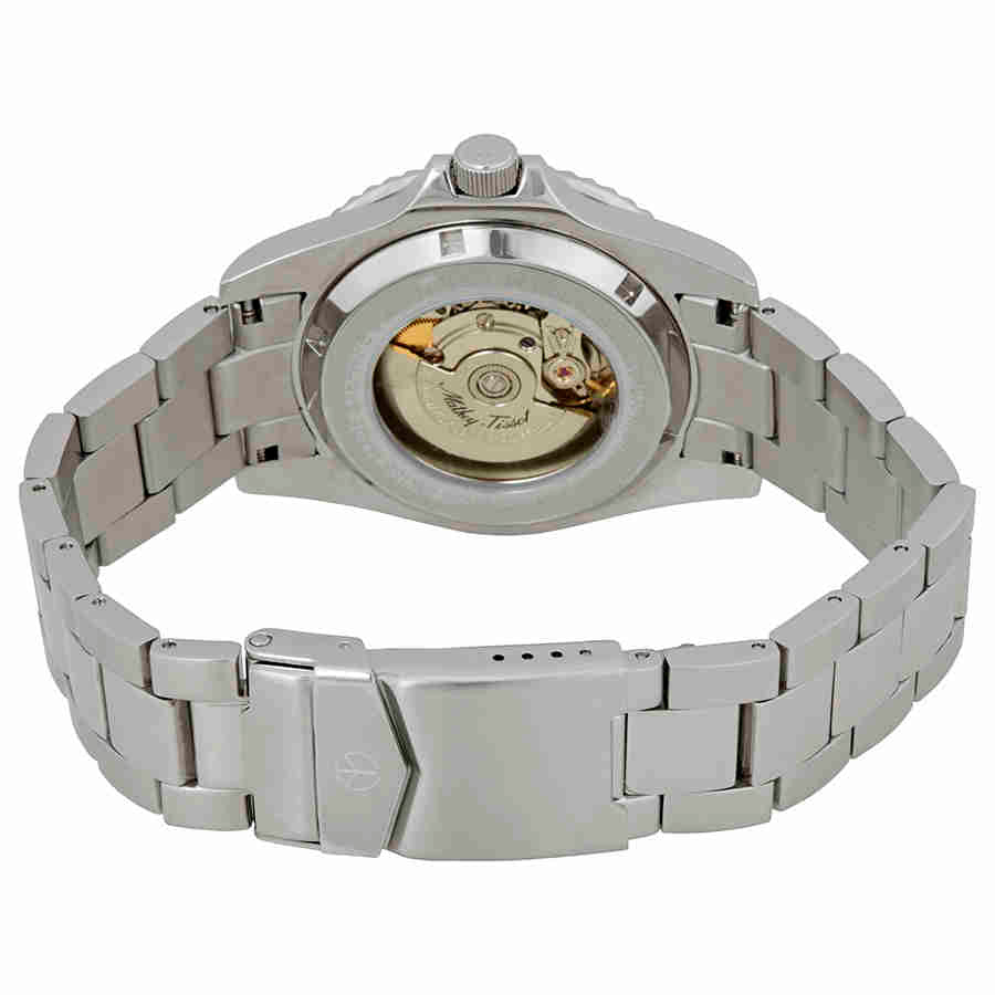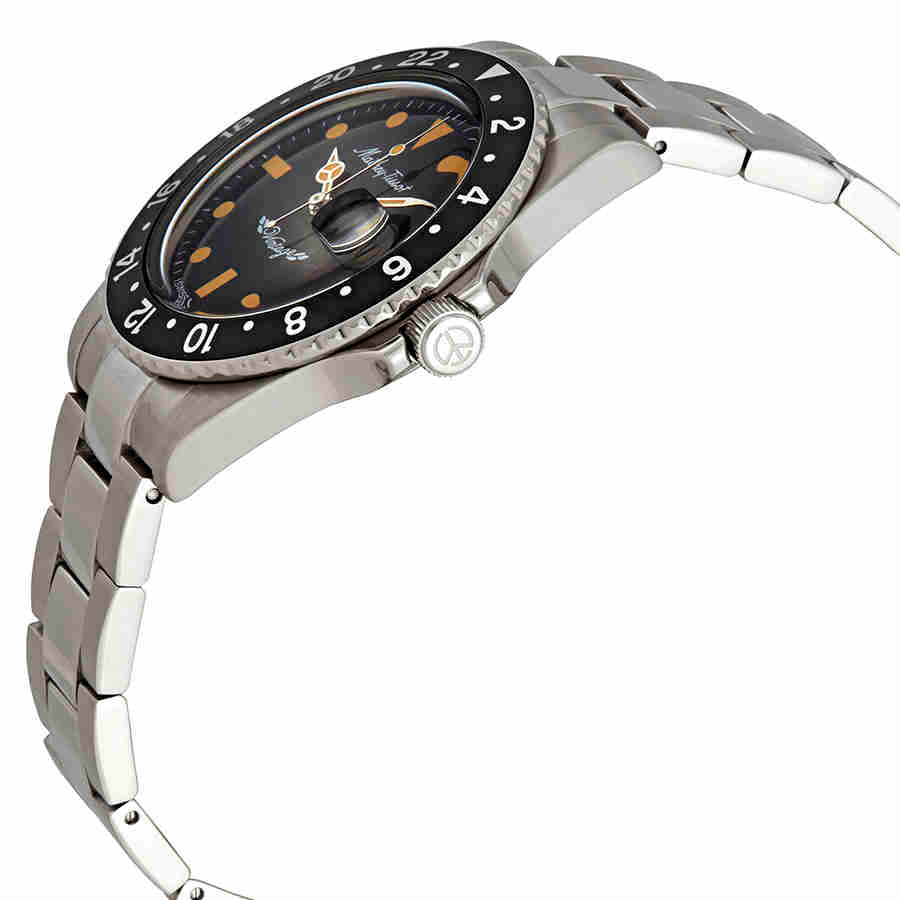Silver-tone stainless steel case with a silver-tone stainless steel bracelet. Uni-directional rotating silver-tone stainless steel with a black top ring showing 24 hour markers bezel. Black dial with gold-tone hands and index hour markers. Minute markers around the outer rim. Dial Type: Analog. Luminescent hands and markers. Date display at the 3 o'clock position. Sellita Caliber SW 200 automatic movement with a 38-hour power reserve. Scratch resistant sapphire coated glass crystal. Screw down crown. Transparent case back. Round case shape, case size: 42 mm, case thickness: 12 mm. Band width: 20 mm. Deployment buckle clasp. Water resistant at 50 meters / 165 feet. Functions: date, hour, minute, second. Casual watch style. Watch label: Swiss Made. Mathey-Tissot Rolly Vintage Automatic Black Dial Mens Watch H901ATN.