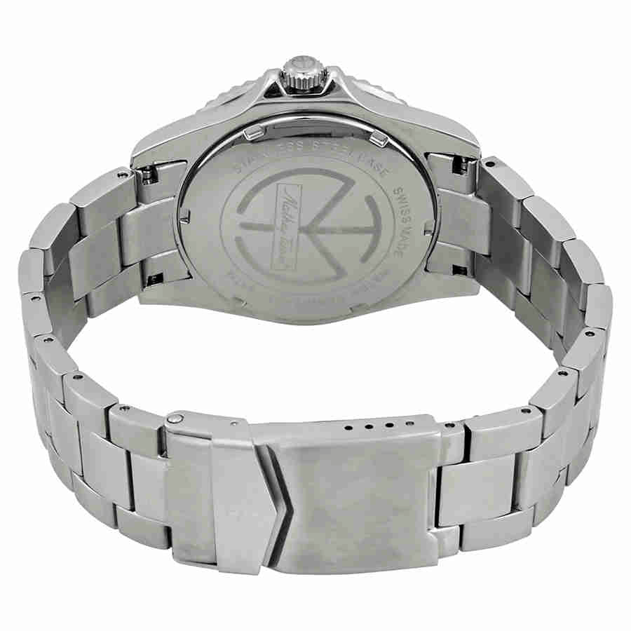 Silver-tone stainless steel case with a silver-tone stainless steel bracelet. Uni-directional rotating black stainless steel bezel. Black dial with gold-tone hands and index hour markers. Minute markers around the outer rim. Dial Type: Analog. Date display at the 3 o'clock position. Ronda Caliber 505 quartz movement. Scratch resistant mineral crystal. Screw down crown. Solid case back. Round case shape, case size: 40 mm, case thickness: 10 mm. Buckle clasp. Water resistant at 50 meters / 165 feet. Functions: date, hour, minute, second. Casual watch style. Watch label: Swiss Made. Mathey-Tissot Rolly Vintage Black Dial Mens Watch H900AN.