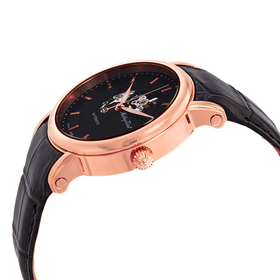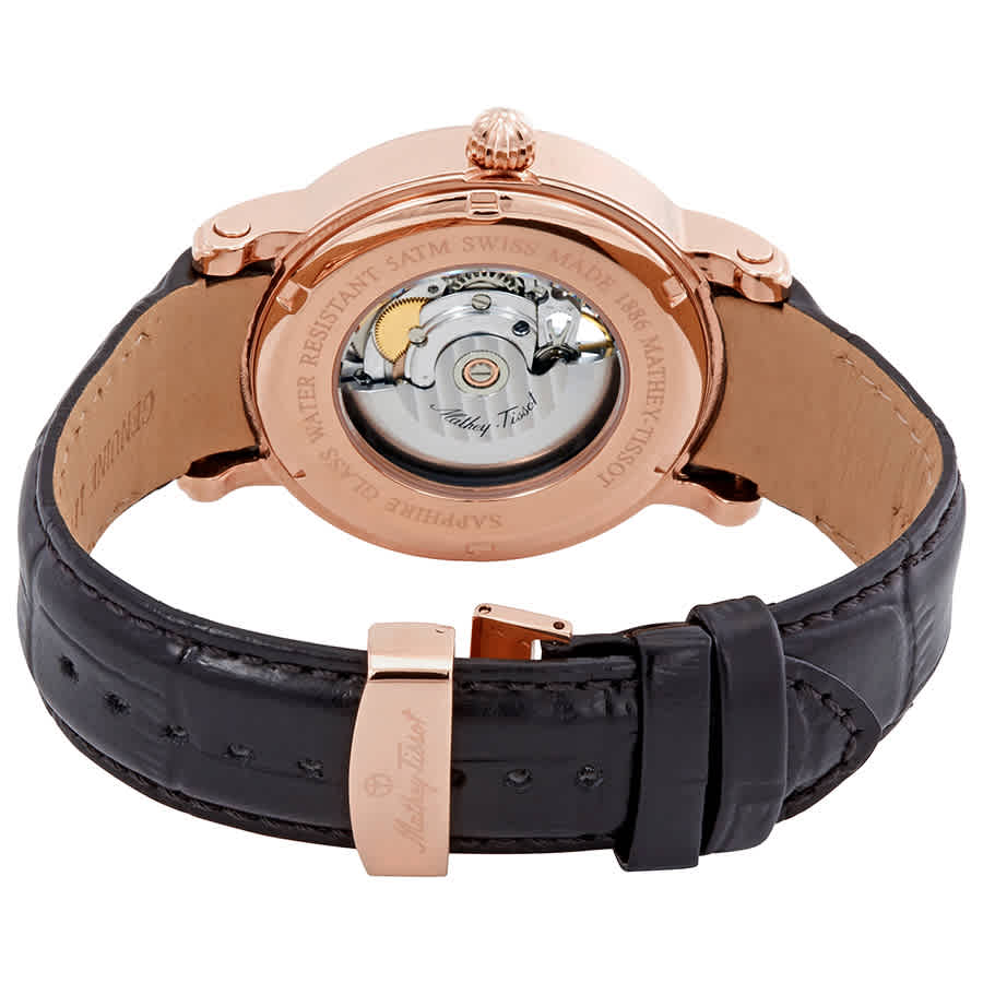 Rose gold PVD stainless steel case with a black leather strap. Fixed rose gold-tone stainless steel bezel. Black dial with rose gold-tone hands and index hour markers. Minute markers around the outer rim. Dial Type: Analog. Luminescent hands. Caliber STP 5-15 automatic movement with a 44-hour power reserve. Scratch resistant sapphire crystal. Pull / push crown. Transparent case back. Round case shape, case size: 43 mm, case thickness: 13 mm. Band width: 22 mm. Deployment clasp. Water resistant at 50 meters / 165 feet. Functions: hour, minute, second. Additional Info: 26 rubies. Casual watch style. Watch label: Swiss Made. Mathey-Tissot Skeleton Black Dial Automatic Mens Watch H7051PN.
