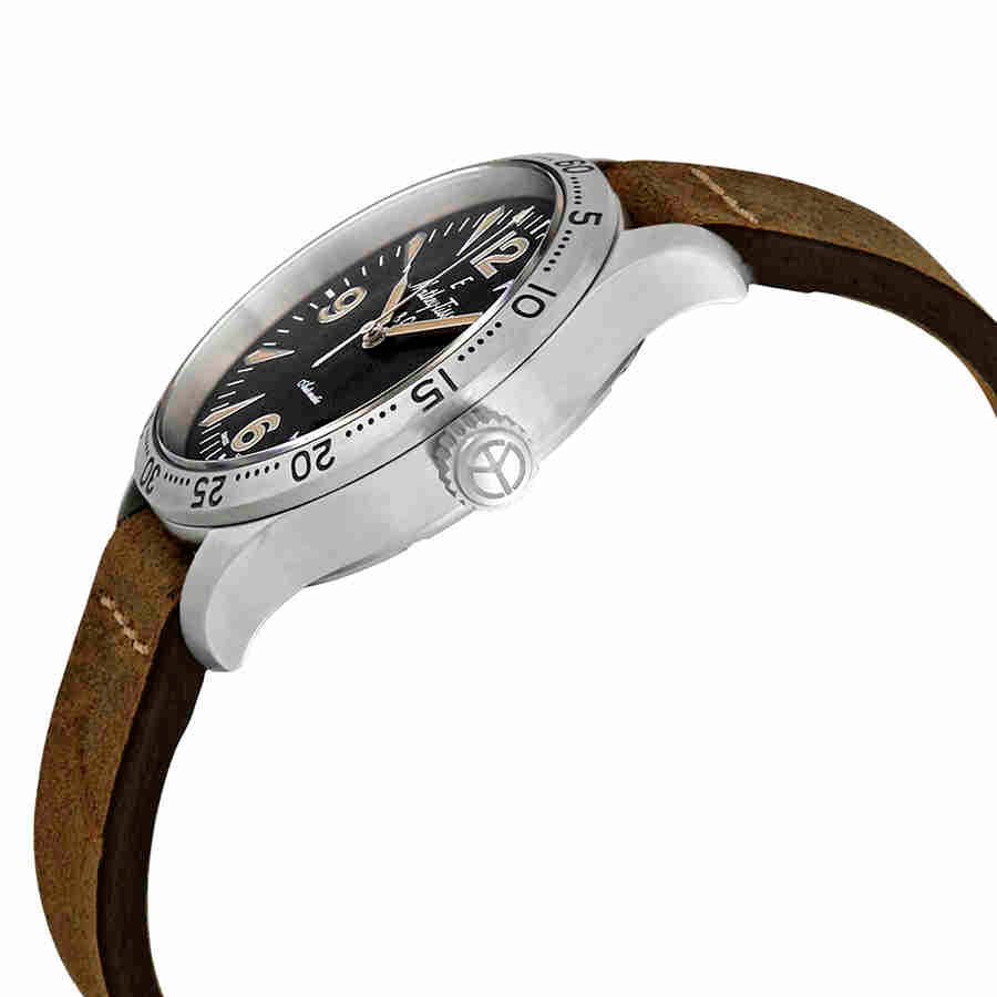 Silver-tone stainless steel case with a brown leather strap. Fixed silver-tone stainless steel bezel. Black dial with silver-tone hands and Arabic numeral and index hour markers. Minute markers around the outer rim. Dial Type: Analog. Luminescent hands and markers. Date display between 4 and 5 o'clock position. Sellita Caliber SW 200-1 automatic movement with a 38-hour power reserve. Scratch resistant sapphire crystal. Pull / push crown. Transparent case back. Round case shape, case size: 42 mm, case thickness: 11 mm. Deployment clasp. Water resistant at 50 meters / 165 feet. Functions: date, hour, minute, second. Sport watch style. Watch label: Swiss Made. Mathey-Tissot Type 21 Automatic Black Dial Mens Watch H1821ATLNO.