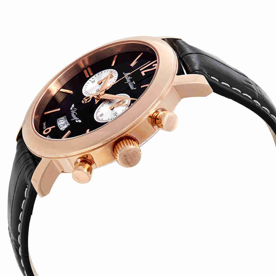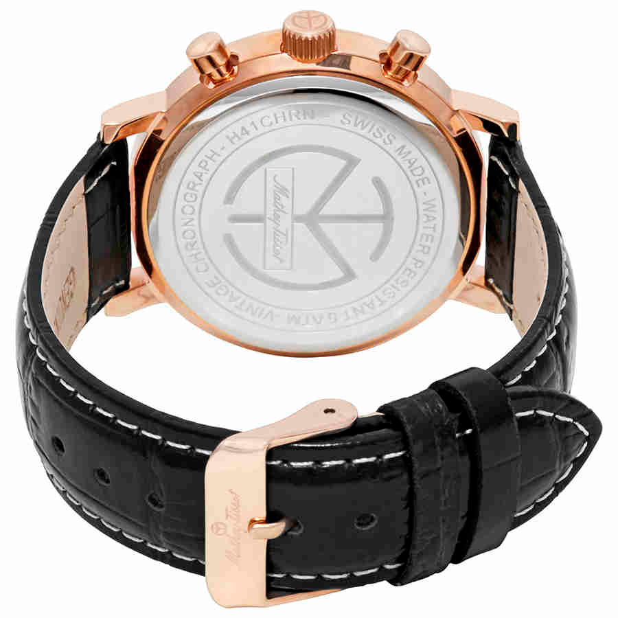 Rose gold PVD stainless steel case with a black leather strap. Fixed rose gold PVD stainless steel bezel. Black dial with rose gold-tone hands and Arabic numeral and index hour markers. Dial Type: Analog. Date display at the 6 o'clock position. Chronograph - sub-dials displaying: two - 60 second, 30 minute. Ronda Caliber quartz movement. Scratch resistant sapphire crystal. Pull / push crown. Solid case back. Round case shape, case size: 41 mm, case thickness: 5 mm. Buckle clasp. Water resistant at 50 meters / 165 feet. Functions: chronograph, date, hour, minute, second. Sport watch style. Watch label: Swiss Made. Mathey-Tissot Vintage Chronograph Black Dial Mens Watch H41CHRN.
