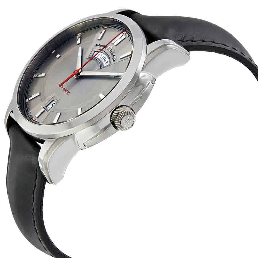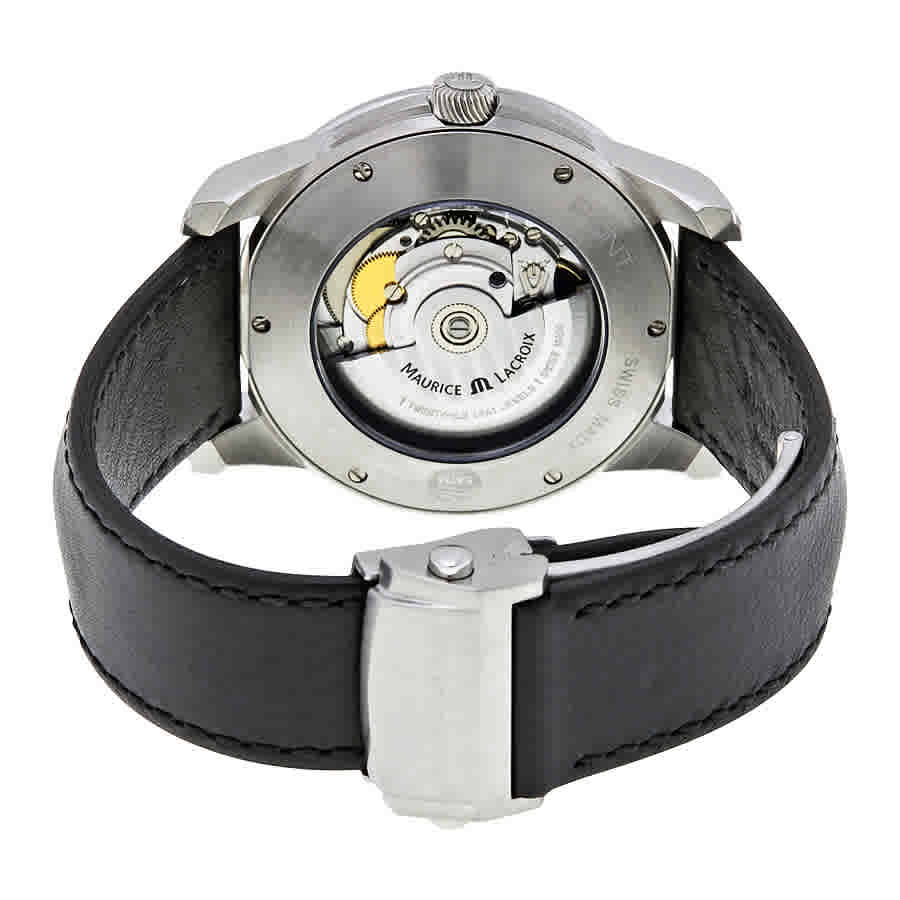 Stainless steel case with a black calfskin leather strap. Fixed steel bezel. Silver dial with silver-tone hands and index hour markers. Minute markers around the outer rim. Dial Type: Analog. Luminescent...