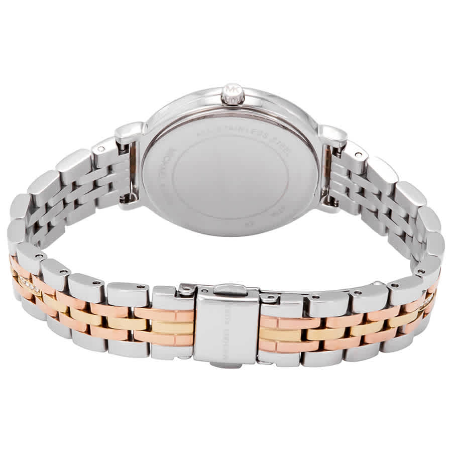 Stainless steel case with a two-tone (silver-tone and rose gold-tone) stainless steel bracelet set with crystals. Fixed stainless steel bezel with a rose gold-tone ring set with crystals. Mother of pearl dial with rose gold-tone hands. Index markers appear at the 3, 6, 9 and 12 o'clock positions. Dial Type: Analog. Quartz movement. Scratch resistant mineral crystal. Pull / push crown. Solid case back. Round case shape. Case size: 33 mm. Case thickness: 7 mm. Band width: 14 mm. Deployment clasp with a push button release. Water resistant at 50 meters / 165 feet. Functions: hour, minute, second. Casual watch style. Michael Kors Cinthia Crystal Mother of Pearl Dial Ladies Watch MK3927.