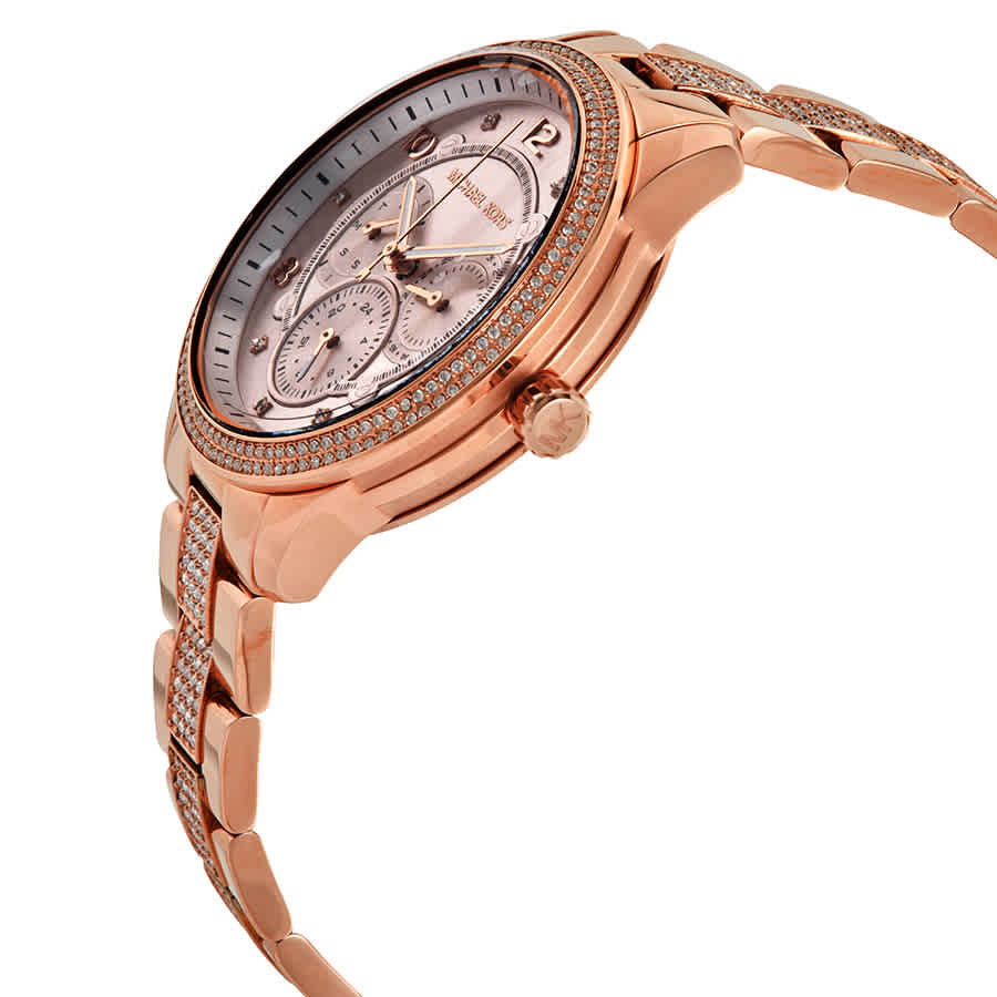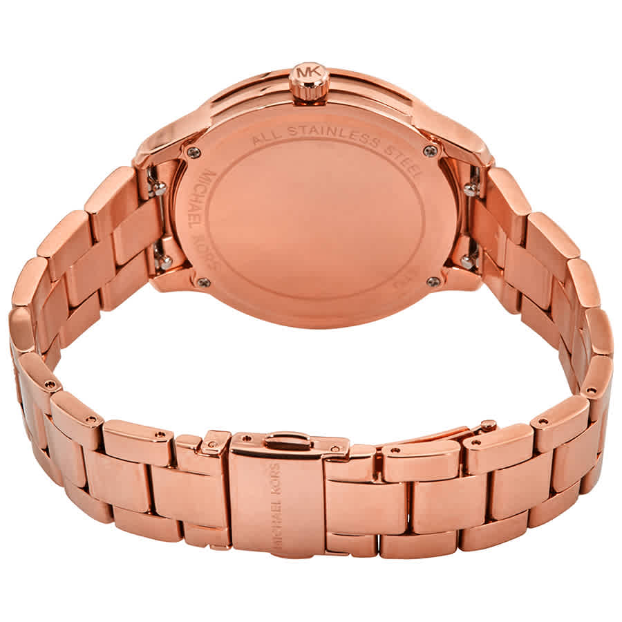 Rose gold-tone stainless steel case with a rose gold-tone stainless steel and crystal set bracelet. Fixed rose gold-tone crystal set bezel. Rose gold-tone dial with rose gold-tone hands and Arabic numeral and crystal hour markers. Minute scale around the inner rim. Dial Type: Analog. Luminescent hands. Day of the week and date - sub dials. Three - day, date and 24 hour subdials. Quartz movement. Scratch resistant mineral crystal. Pull / push crown. Solid case back. Round case shape, case size: 38 mm, case thickness: 8 mm. Band width: 18 mm. Fold over with safety release clasp. Water resistant at 50 meters / 165 feet. Functions: date, day, hour, minute, second, 24 hour. Dress watch style. Watch label: Japan Movt. Michael Kors Cooper Quartz Crystal Rose Gold Dial Ladies Watch MK6614.