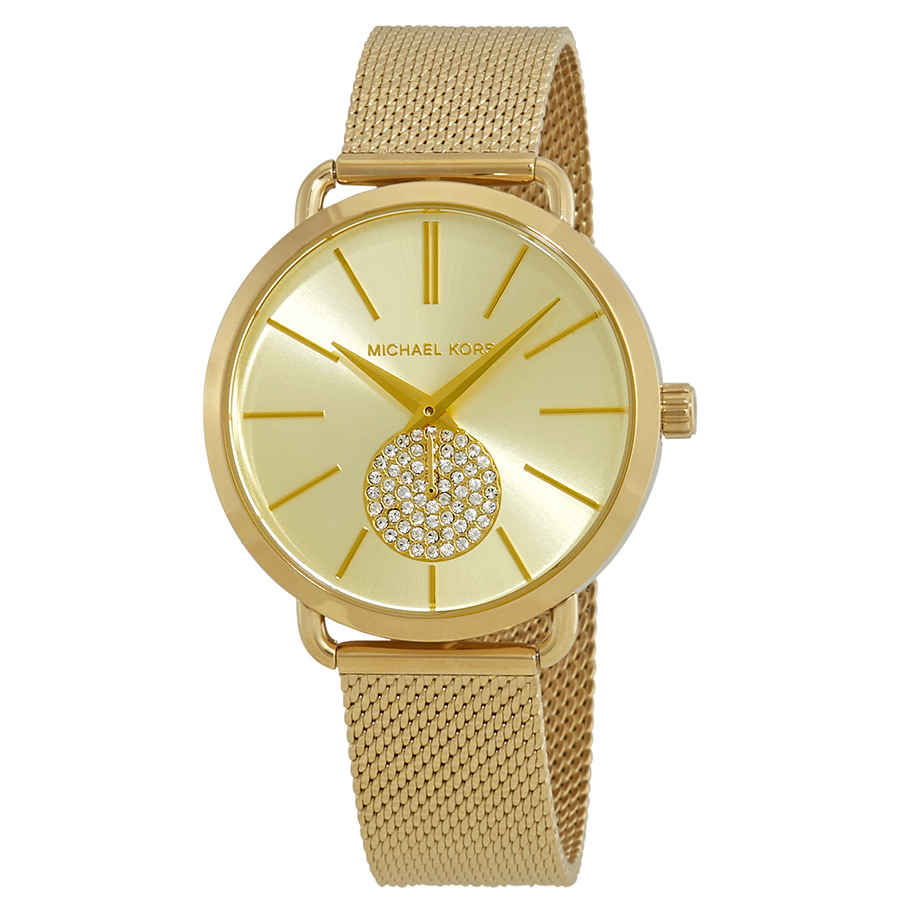 Gold-tone stainless steel case with a gold-tone stainless steel mesh bracelet. Fixed gold-tone stainless steel bezel. Gold dial with gold-tone hands and index hour markers. Dial Type: Analog. Crystal-set seconds sub-dial. Quartz movement. Scratch resistant mineral crystal. Pull / push crown. Solid case back. Round case shape, case size: 37 mm, case thickness: 8 mm. Band width: 16 mm. Sliding clasp. Water resistant at 50 meters / 165 feet. Functions: hour, minute, second. Casual watch style. Michael Kors Porita Gold Dial Ladies Watch MK3844.