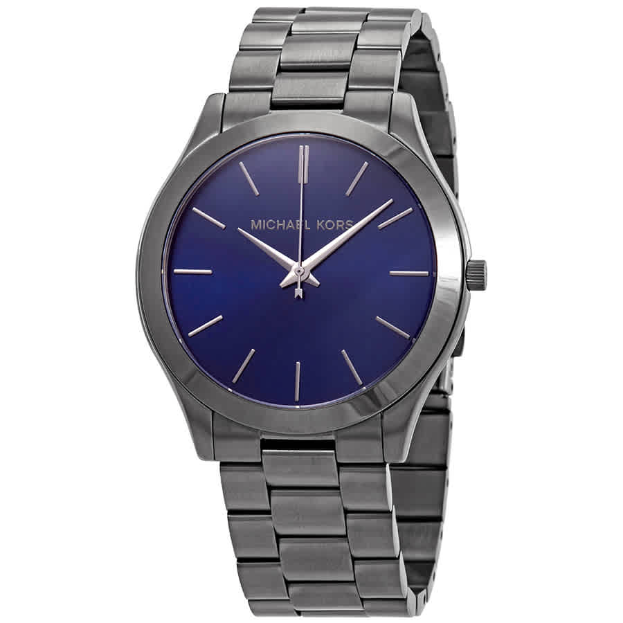 Gunmetal stainless steel case with a gunmetal stainless steel bracelet. Fixed gunmetal stainless steel bezel. Blue dial with gunmetal hands and index hour markers. Dial Type: Analog. Quartz movement. Round case shape. Case size: 44 mm. Water resistant at 50 meters / 165 feet. Functions: hour, minute, second. Casual watch style. Michael Kors Slim Runway Blue Dial Mens Watch MK8584.