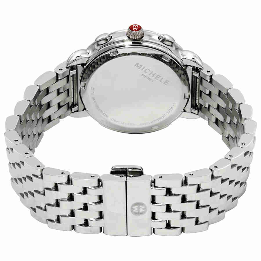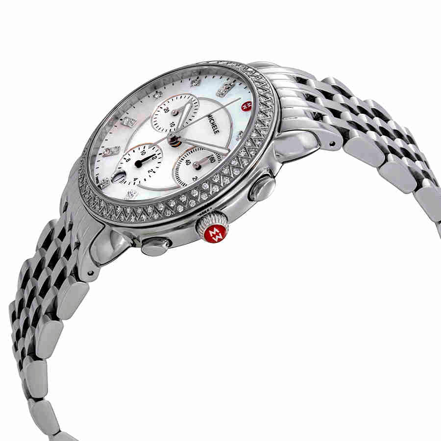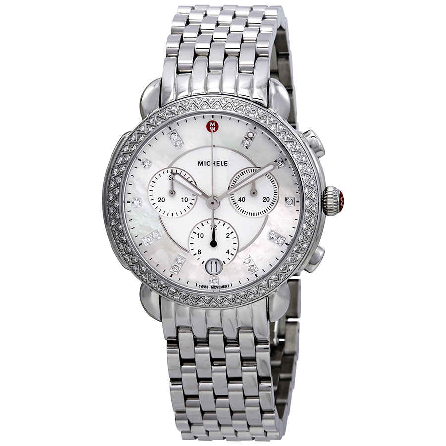 Stainless steel case with a stainless steel bracelet. Fixed stainless steel bezel set with diamonds. Mother of pearl dial with luminous silver-tone hands and diamond hour markers. Minute markers around the outer rim. Dial Type: Analog. Luminescent hands. Date display at the 6 o'clock position. Chronograph - three sub-dials displaying: 60 second, 30 minute and 12 hours. Quartz movement. Scratch resistant sapphire crystal. Solid case back. Round case shape. Case size: 38 mm. Case thickness: 11 mm. Band width: 18 mm. Deployment clasp with a push button release. Water resistant at 50 meters / 165 feet. Functions: chronograph, date, hour, minute, second. Additional Info: in general, suitable for short periods of recreational swimming, but not diving or snorkeling. Dress watch style. Watch label: Swiss Made. Michele Sidney Chronograph Diamond Ladies Watch MWW30A000001.