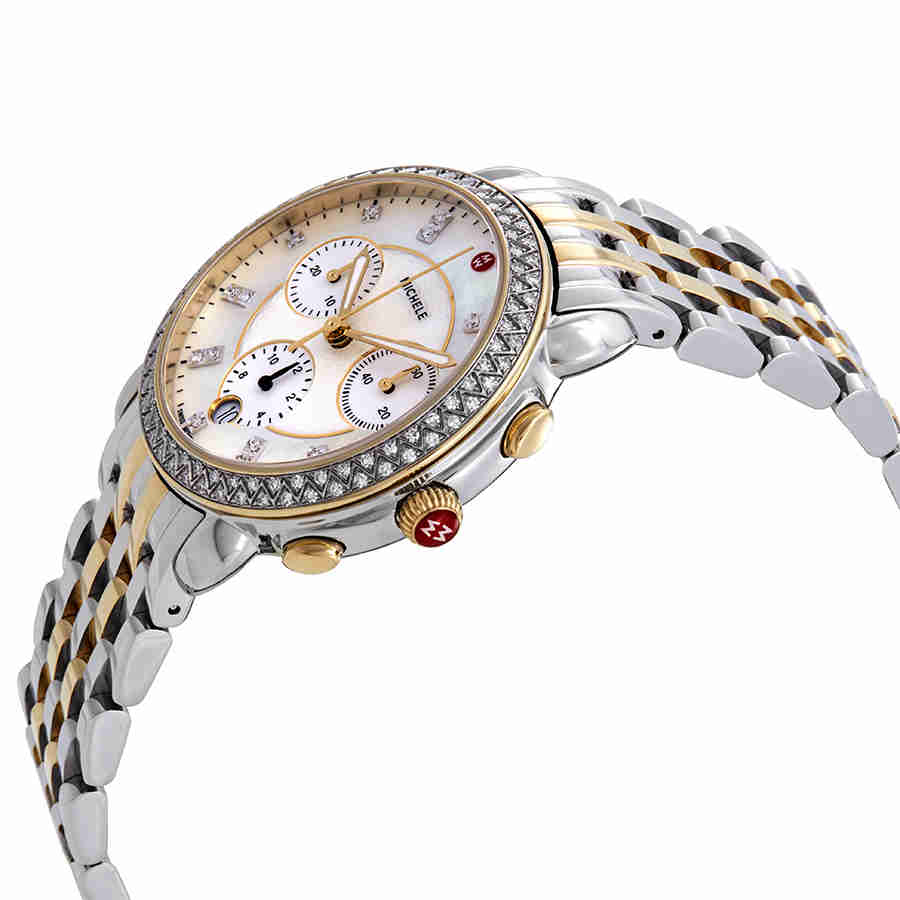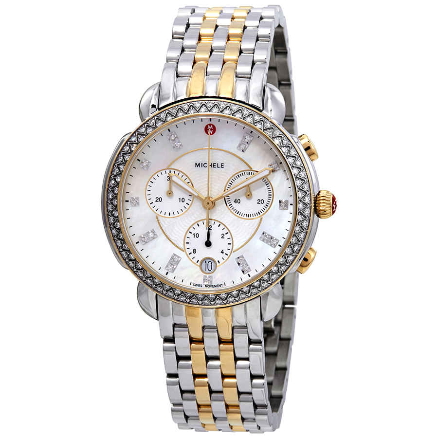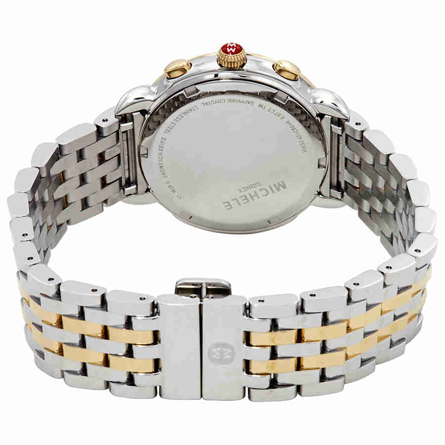Silver and gold-tone stainless steel case with a silver and gold-tone stainless steel bracelet. Fixed stainless steel- diamond set bezel. Mother of pearl dial with gold-tone hands and silver-tone hour markers....