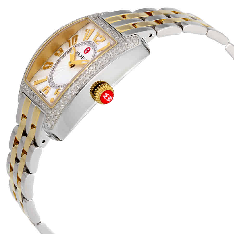 Stainless steel case with a two-tone (silver and yellow gold-plated) stainless bracelet. Fixed stainless steel bezel set with diamonds. Silver guilloche diamond-set dial with luminous yellow gold-tone hands and Arabic numeral hour markers. Dial Type: Analog. Luminescent hands. Quartz movement. Scratch resistant sapphire crystal. Pull / push crown. Solid case back. Case dimensions: 29 mm x 31 mm. Rectangle case shape. Band width: 16 mm. Deployment clasp. Water resistant at 50 meters / 165 feet. Functions: hour, minute. Dress watch style. Michele Urban Mini Diamond Ladies Watch MWW02A000599.